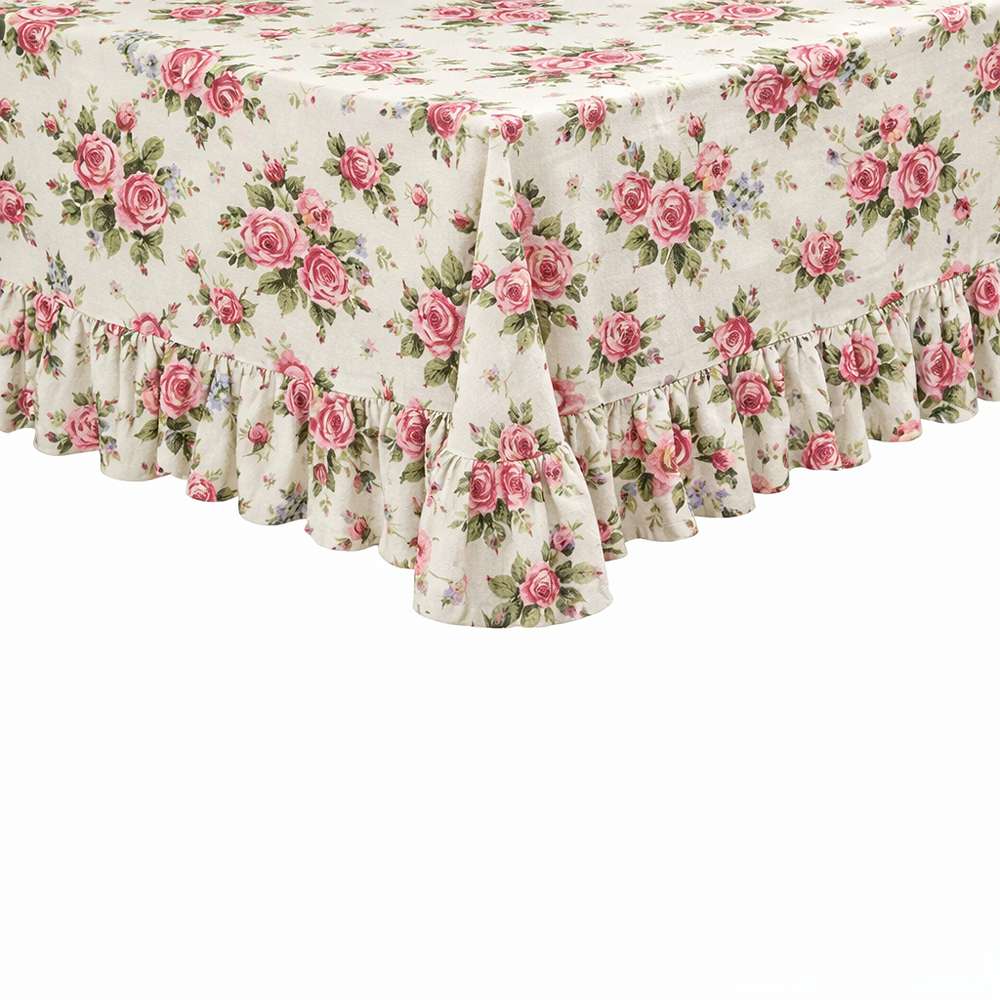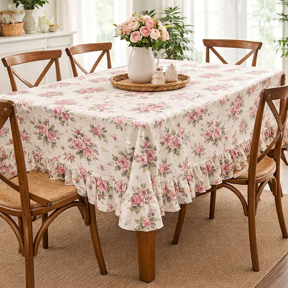 La stampa floreale è distribuita armoniosamente su tutta la superficie, creando un effetto elegante e raffinato. Il dettaglio distintivo è la rouche applicata lungo tutto il perimetro: una balza arricciata che dona movimento, volume e un tocco femminile davvero unico. La caduta morbida del tessuto valorizza la tavola, rendendola accogliente e scenografica.