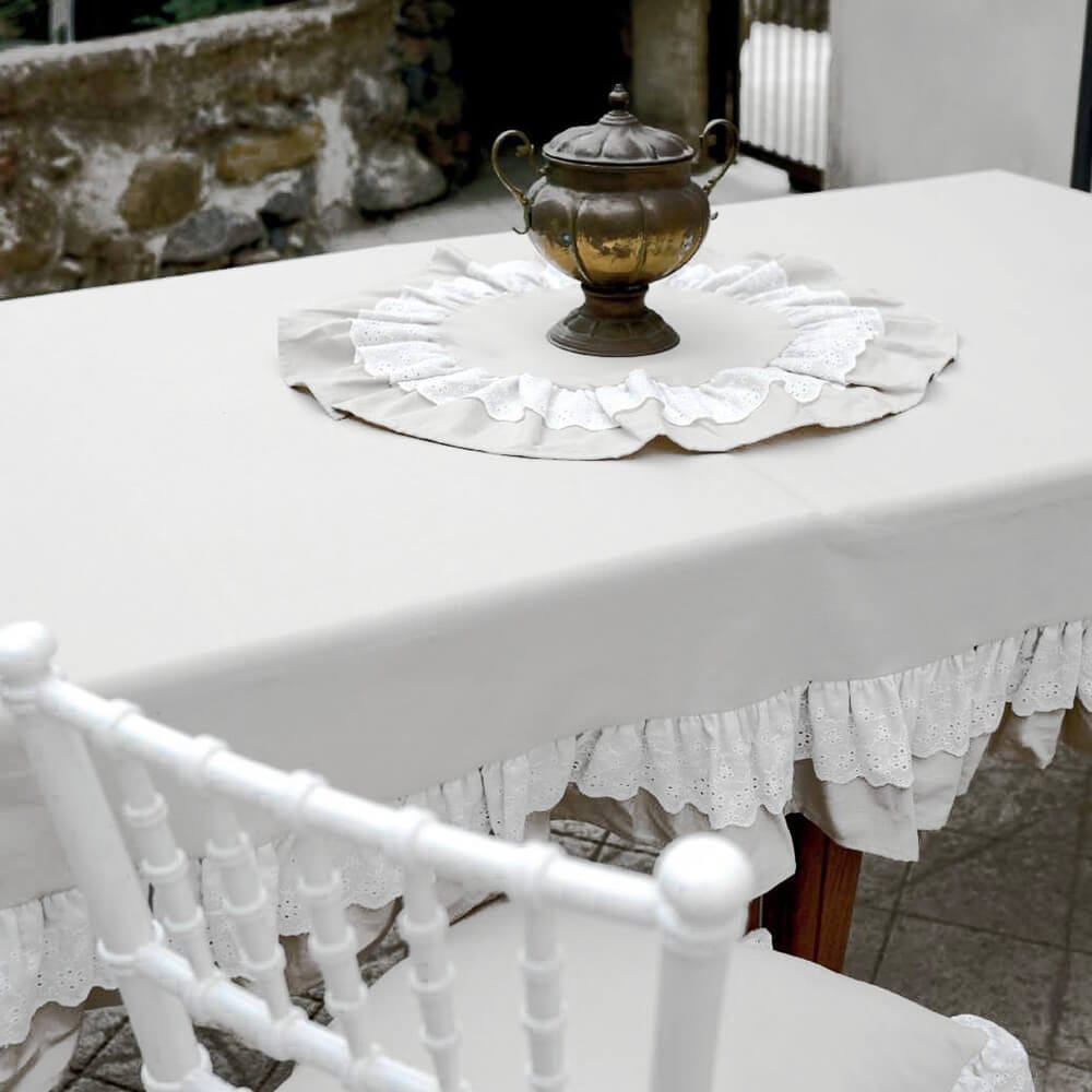 La tovaglia della collezione Lulù firmata Clodette veste la tavola con delicatezza e charme. In color bianco, è impreziosita da una rouche ampia rifinita da un romantico bordo in pizzo Sangallo bianco.