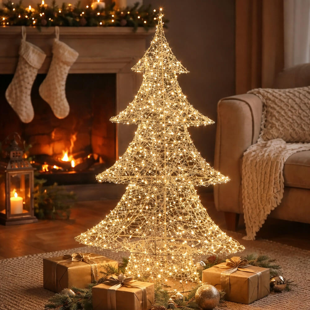 Albero decorativo in metallo dorato intrecciato, arricchito da 600 microled a luce calda con effetto perlato. Perfetto per ambienti interni eleganti o esterni coperti.