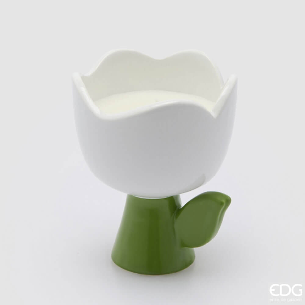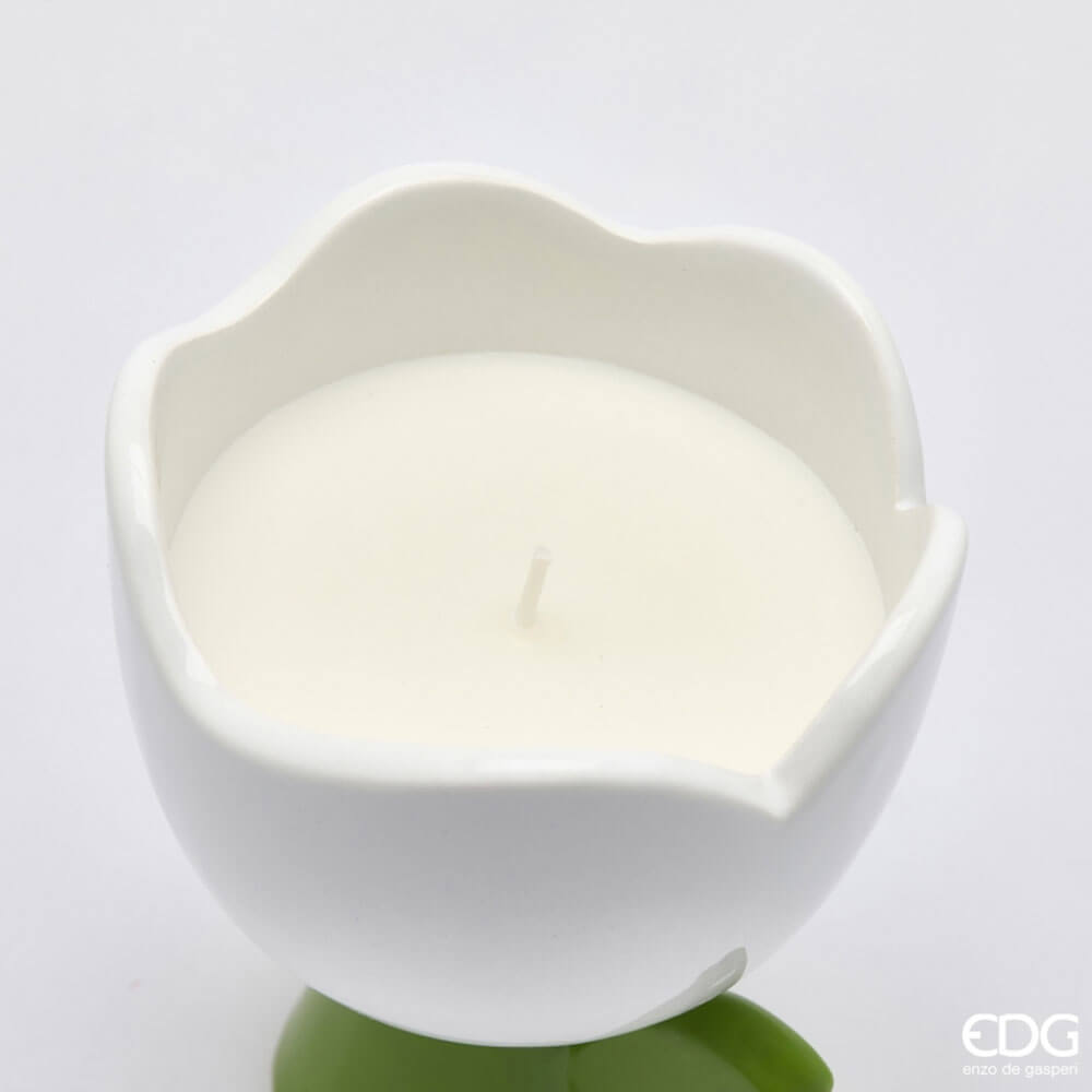 Un dettaglio chic che profuma la casa con delicatezza: questa candela profumata Enzo de Gasperi è racchiusa in un contenitore in ceramica lucida a forma di tulipano. La corolla bianca, con bordo ondulato “a petalo”, è abbinata allo stelo verde con foglia laterale per un effetto fresco e naturale, perfetto in qualsiasi stile d’arredo. La cera bianca con stoppino centrale diffonde una luce morbida e accogliente. La profumazione Frangipani regala una sensazione floreale e luminosa, ideale in bagno, camera o su una consolle d’ingresso. Formato 150 g con durata indicativa 18 ore.