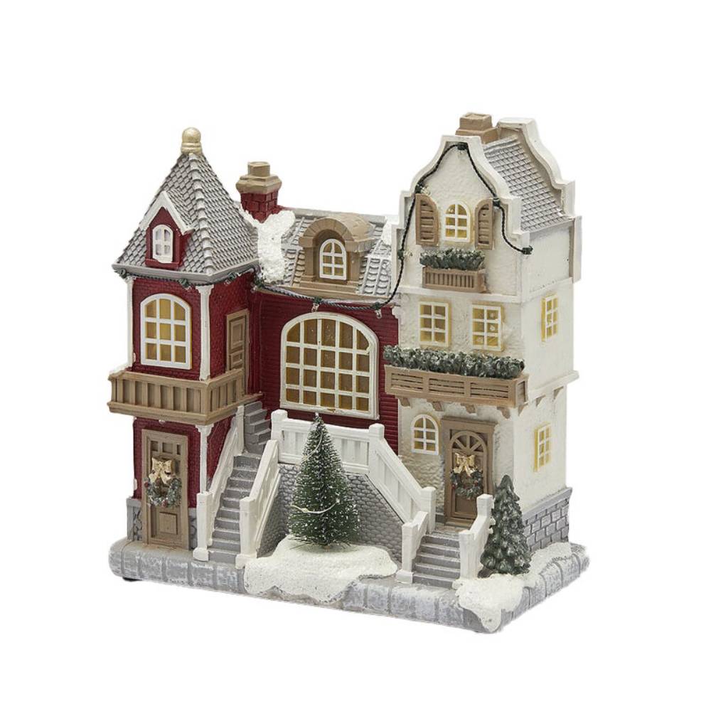 Casetta natalizia in resina decorata con dettagli innevati, luci LED calde e musica natalizia. Funziona con 3 batterie AA (non incluse).