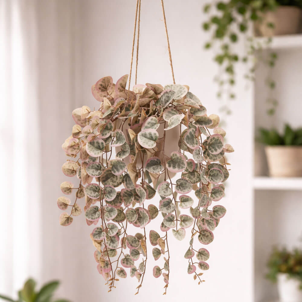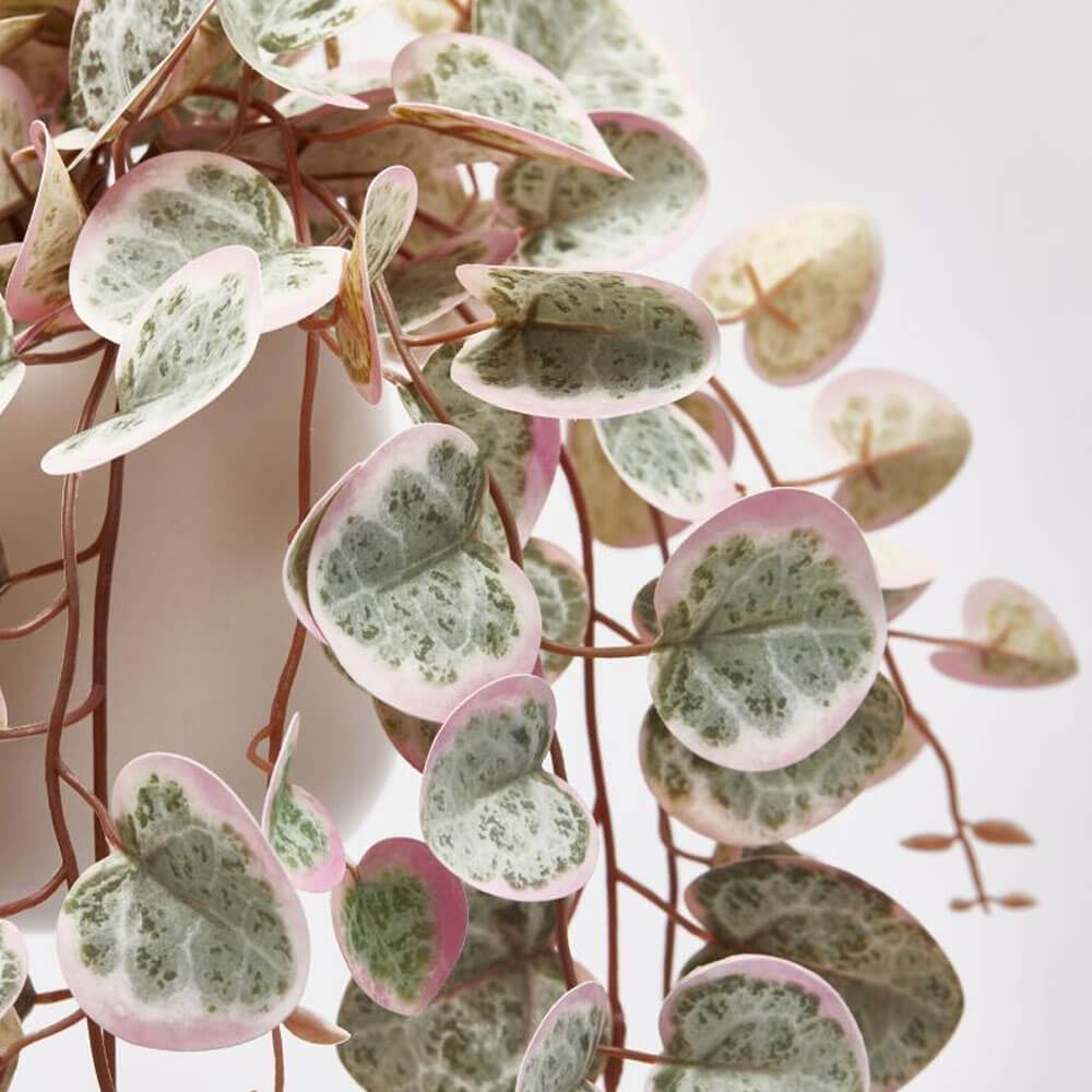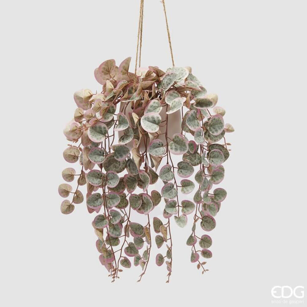 Ceropegia artificiale EDG con foglie a cuore variegate verde e rosa, vaso da appendere incluso. Delicata e decorativa.
