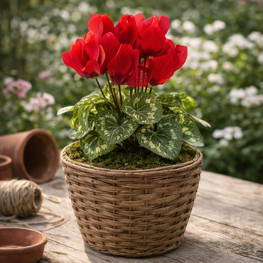 Questo cespuglio di ciclamino rosso firmato Enzo de Gasperi colpisce per il colore vivido dei fiori e le foglie verdi con eleganti venature chiare. Realizzato in plastica di qualità, presenta petali sottili dall’effetto leggermente satinato e steli flessibili che donano un aspetto naturale e armonioso.