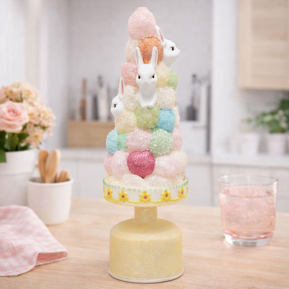 Questo Topiary Twist firmato Enzo de Gasperi è un raffinato decoro pasquale in vetro, caratterizzato da una composizione verticale di sfere glitterate nei toni pastello e piccoli coniglietti bianchi inseriti nella struttura. La finitura luminosa e le delicate sfumature gialle donano leggerezza e gioia visiva.