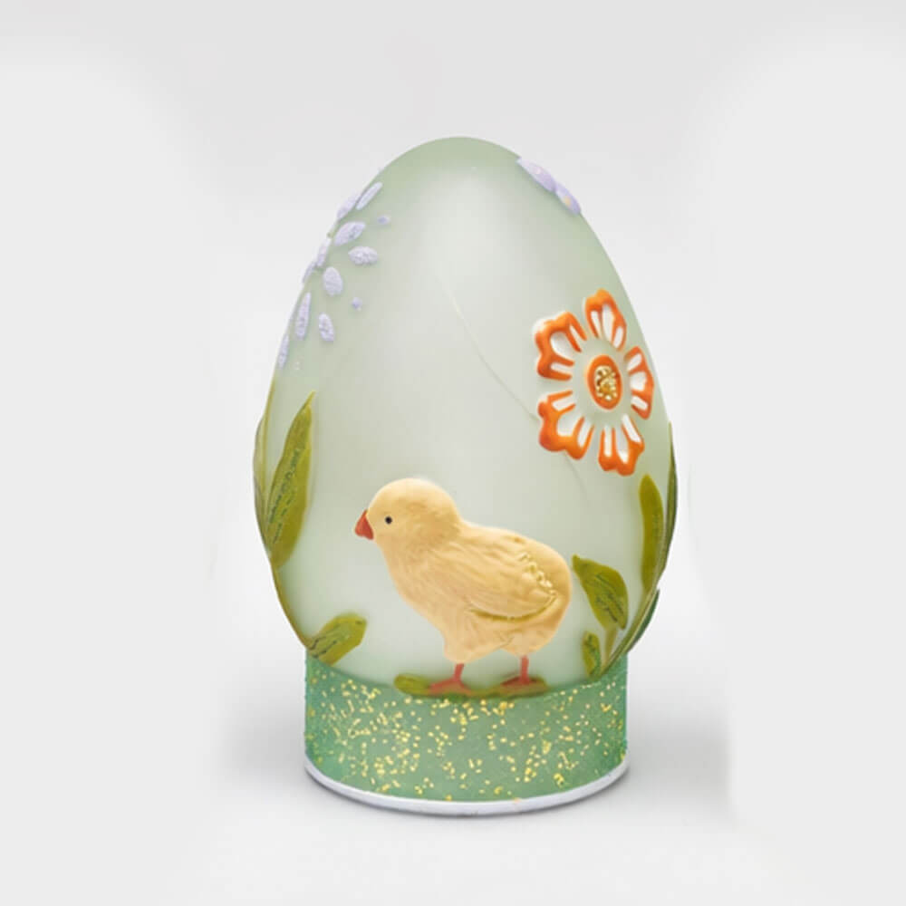 Questo decoro a uovo Twist di Enzo de Gasperi è realizzato in vetro satinato verde tenue e arricchito da un delicato pulcino giallo in rilievo, simbolo di rinascita e primavera. La superficie è impreziosita da fiori stilizzati, foglioline in rilievo e piccoli dettagli decorativi che donano profondità e armonia cromatica.