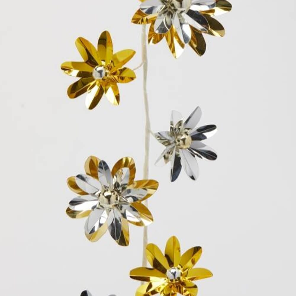 Il festone Gerbera Metal di Enzo de Gasperi è un elemento decorativo raffinato e moderno, perfetto per aggiungere un tocco scintillante alle tue decorazioni natalizie. Realizzato con fiori in metallo effetto specchiato nei toni dell’oro e dell’argento, alternati lungo un filo sottile con occhielli per l’aggancio. La sua lunghezza di 182 cm lo rende versatile: puoi usarlo su alberi, camini, porte o composizioni da tavolo.