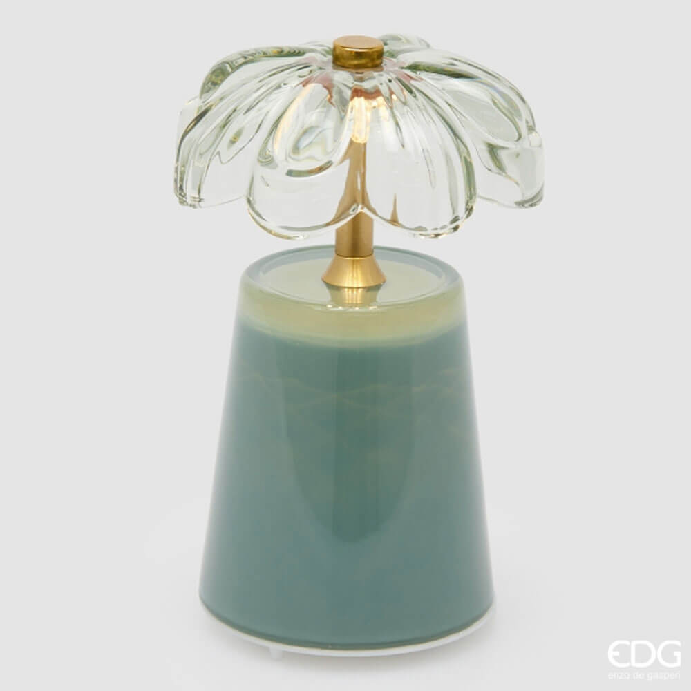 La lampada da tavolo Lily verde di Enzo de Gasperi è un elegante oggetto luminoso dal design floreale raffinato. Il paralume in vetro trasparente, modellato come un fiore dai petali morbidi e ondulati, diffonde una luce delicata e avvolgente. Lo stelo centrale in metallo con finitura dorata crea un contrasto prezioso con la base verde lucida, dalla forma svasata e armoniosa. Dotata di batteria al litio ricaricabile tramite USB, con autonomia fino a 30 ore, è ideale per comodini, tavolini e angoli relax. Completa di scatola regalo, è perfetta anche come idea dono elegante.