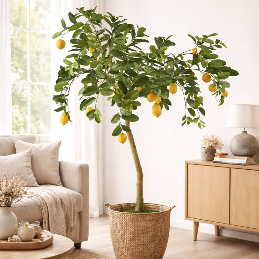 Pianta di limone decorativa EDG con 19 frutti realistici. Foglie verdi intense, tronco naturale e vaso base. Adatta anche per esterni.