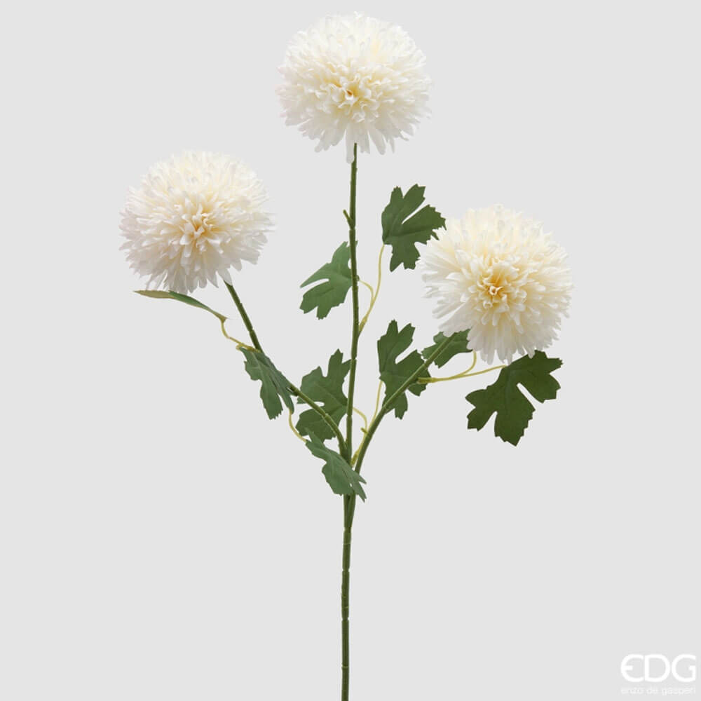 Questo ramo di dalia ponpon Bliss di Enzo de Gasperi si distingue per il fiore sferico ricco di petali sottili e stratificati, dal colore bianco avorio con leggere sfumature calde al centro.