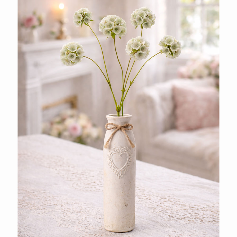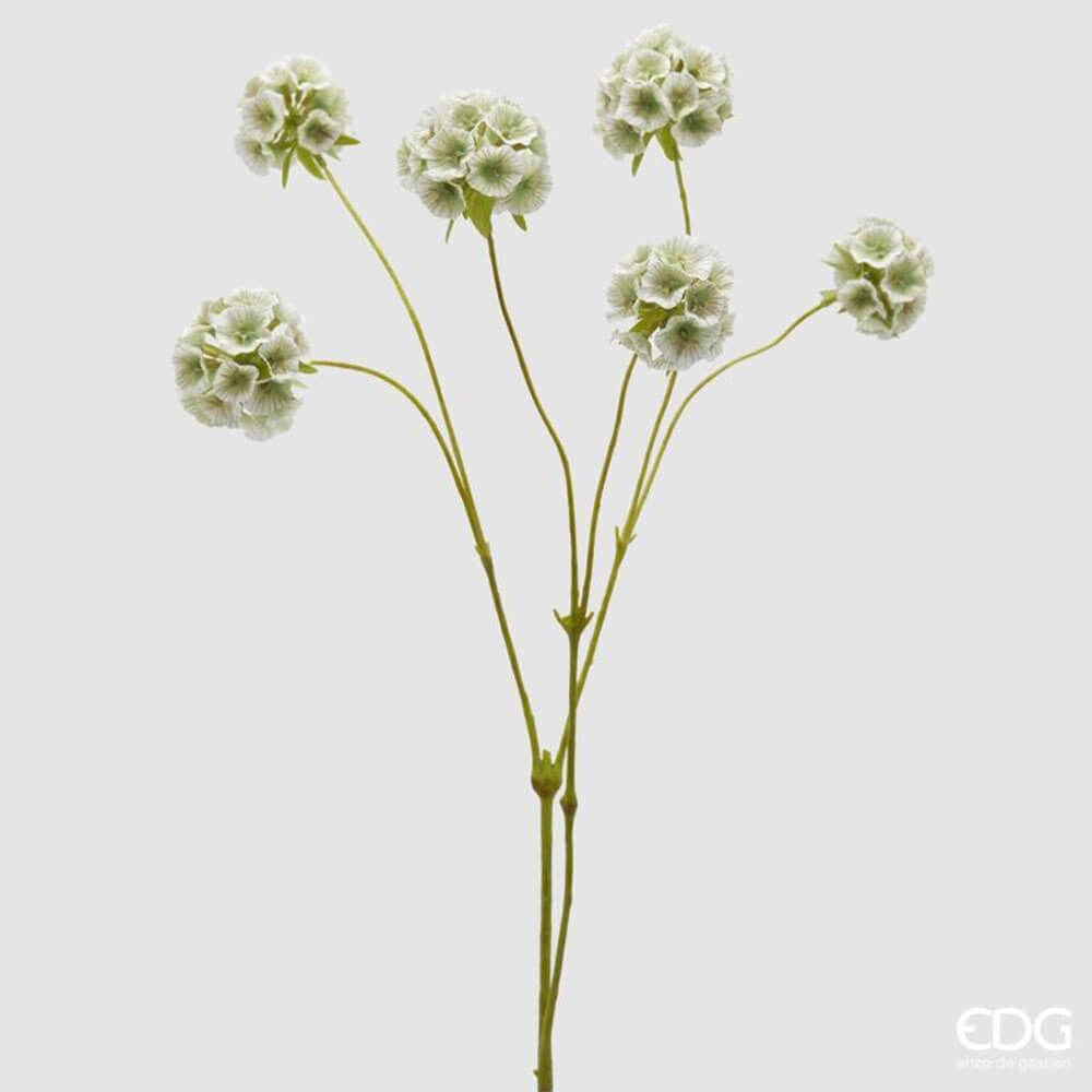 Il ramo di scabiosa bianca Enzo de Gasperi è un fiore artificiale dal design delicato e contemporaneo. I sei fiori sferici presentano petali sottili con leggere venature verde chiaro che donano profondità e un effetto estremamente naturale.