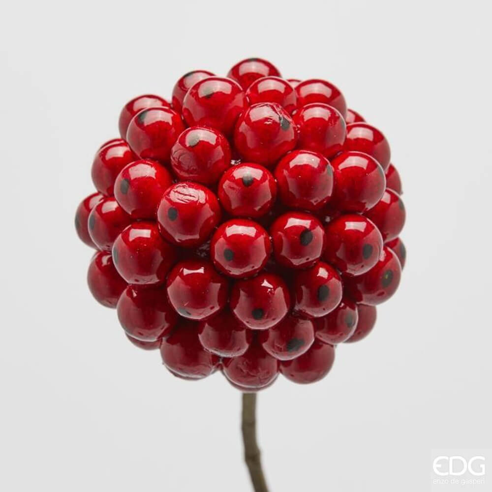 Composto da tre sfere voluminose realizzate con piccole bacche rosso lucido, ogni dettaglio è curato per ottenere un effetto realistico e luminoso. Lo stelo lungo e flessibile permette di modellarlo facilmente in vasi alti, ghirlande o centrotavola.