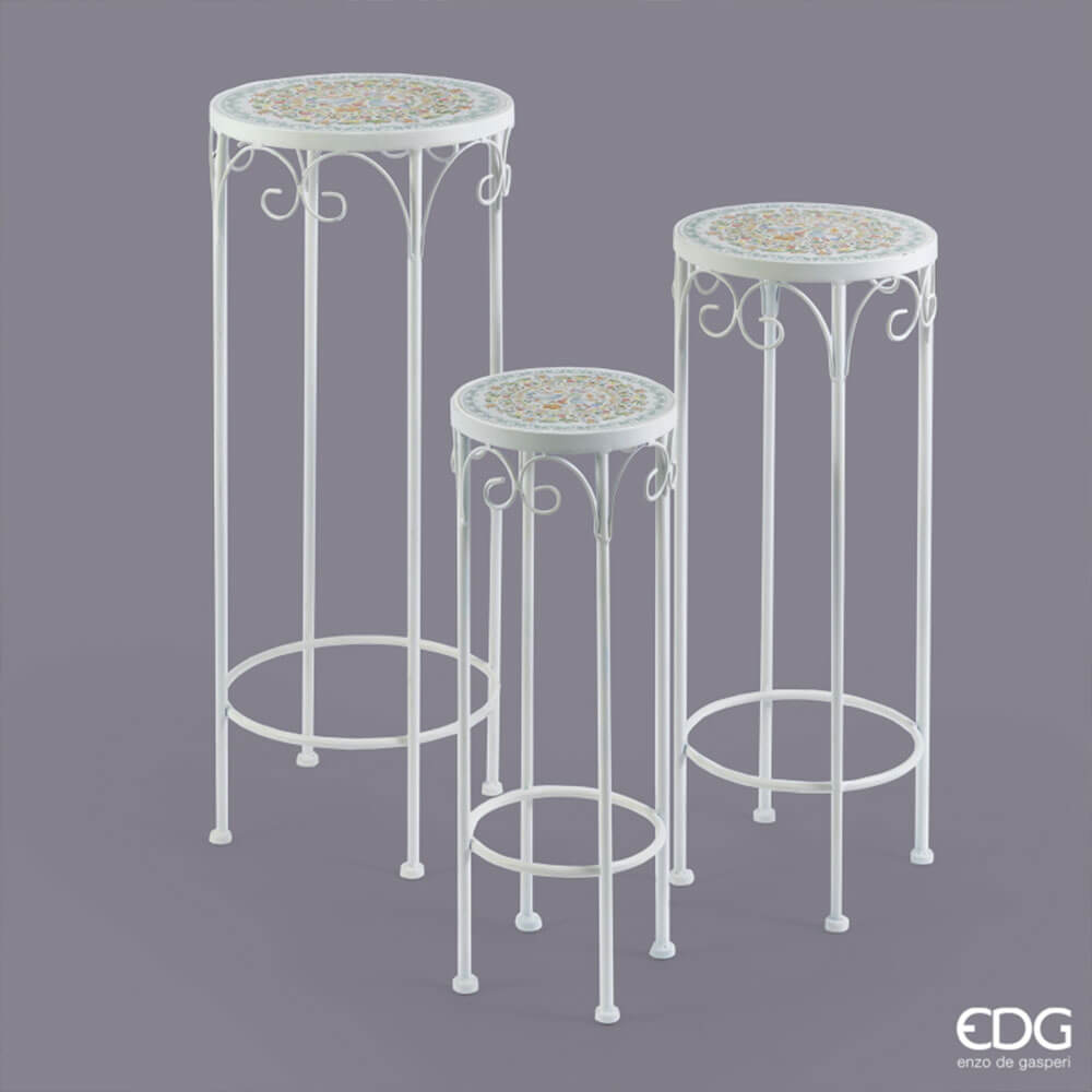 Questo set di tre tavolini porta vasi firmato Enzo de Gasperi è pensato per arredare con gusto romantico e raffinato spazi esterni come giardini, terrazzi e verande. La struttura slanciata in metallo verniciato bianco presenta linee morbide e riccioli decorativi, mentre i piani rotondi in ceramica sono impreziositi da motivi floreali e uccellini dipinti nei toni pastello, con bordo verde salvia puntinato. Le tre diverse altezze permettono di creare composizioni dinamiche e armoniose, perfette per mettere in risalto vasi e piante fiorite.