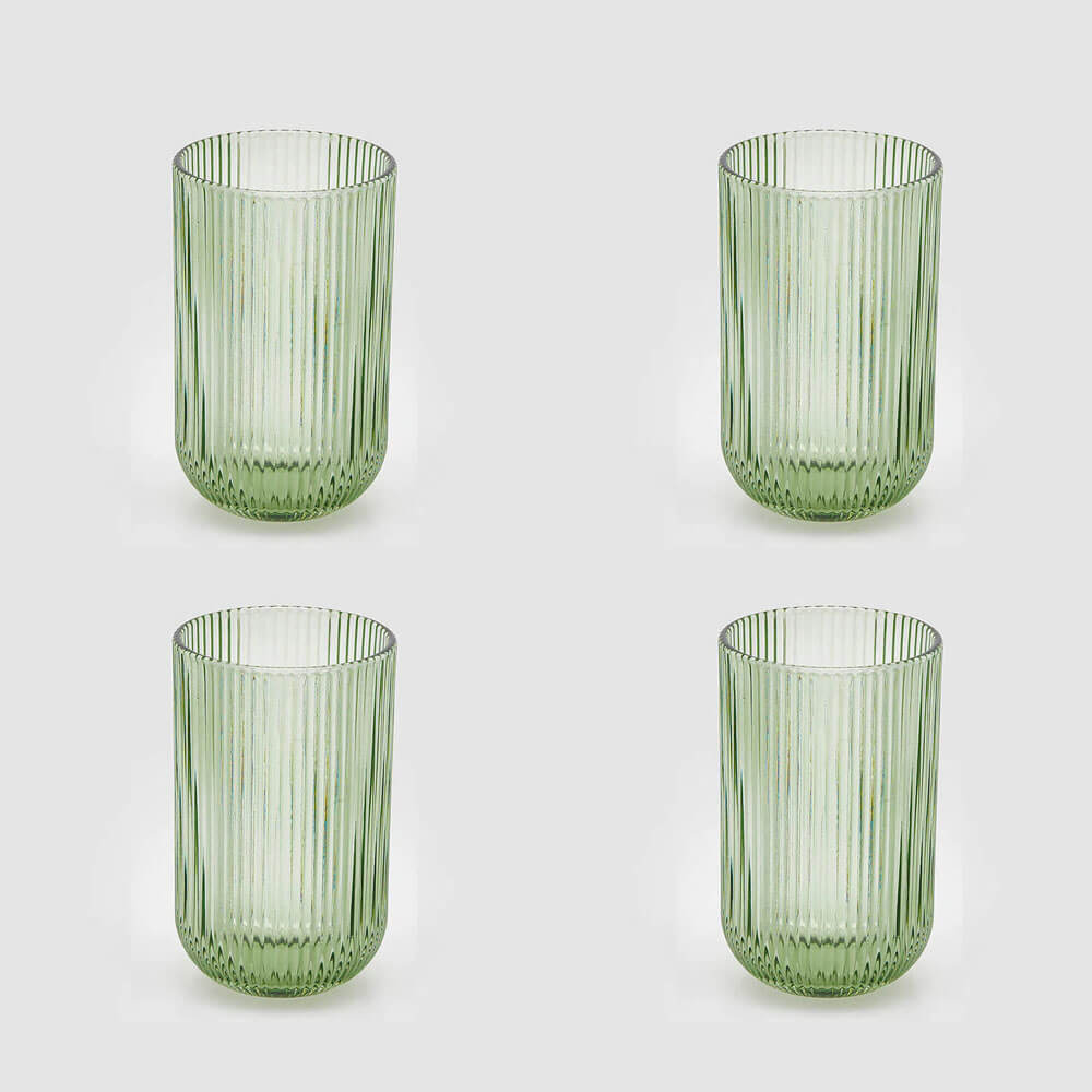 Questo set da 4 bicchieri firmato Enzo de Gasperi è realizzato in vetro verde trasparente con un’elegante lavorazione rigata verticale che riflette delicatamente la luce. Il fondo leggermente bombato dona solidità e una silhouette raffinata.