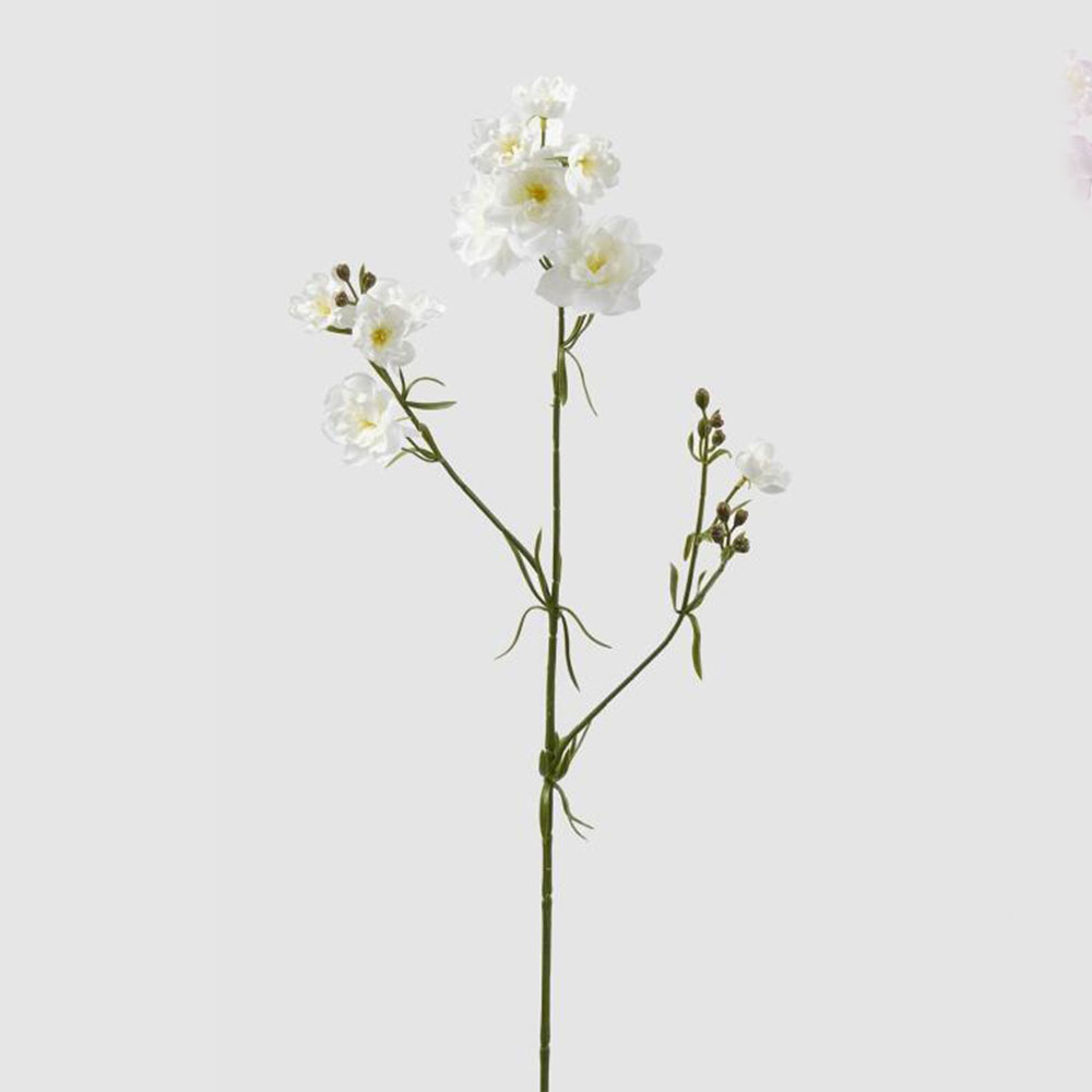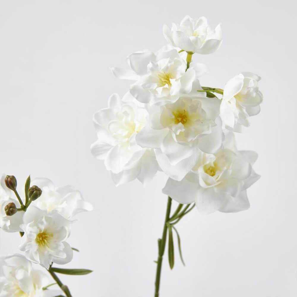 Il ramo di speronella bianca Enzo de Gasperi è una proposta floreale artificiale dall’aspetto delicato e realistico. I fiori, realizzati in plastica di qualità, presentano petali bianchi leggermente mossi con cuore giallo tenue, mentre le foglie sottili e allungate donano leggerezza alla composizione.