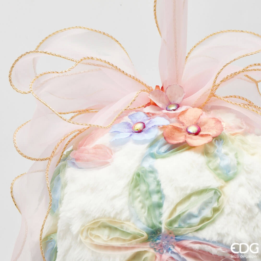 Uovo decorativo bianco da appendere in polistirolo e tessuto, con fiocco in organza e fiori pastello. Raffinato e romantico.