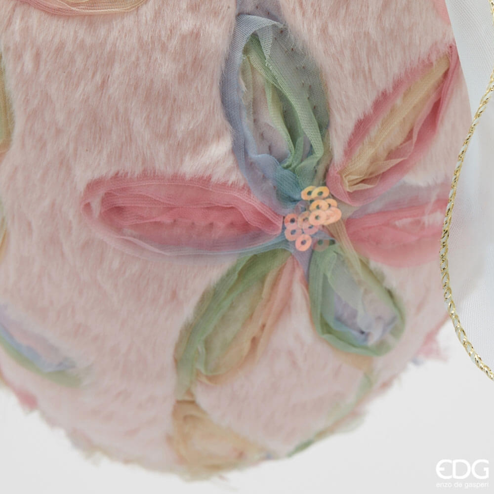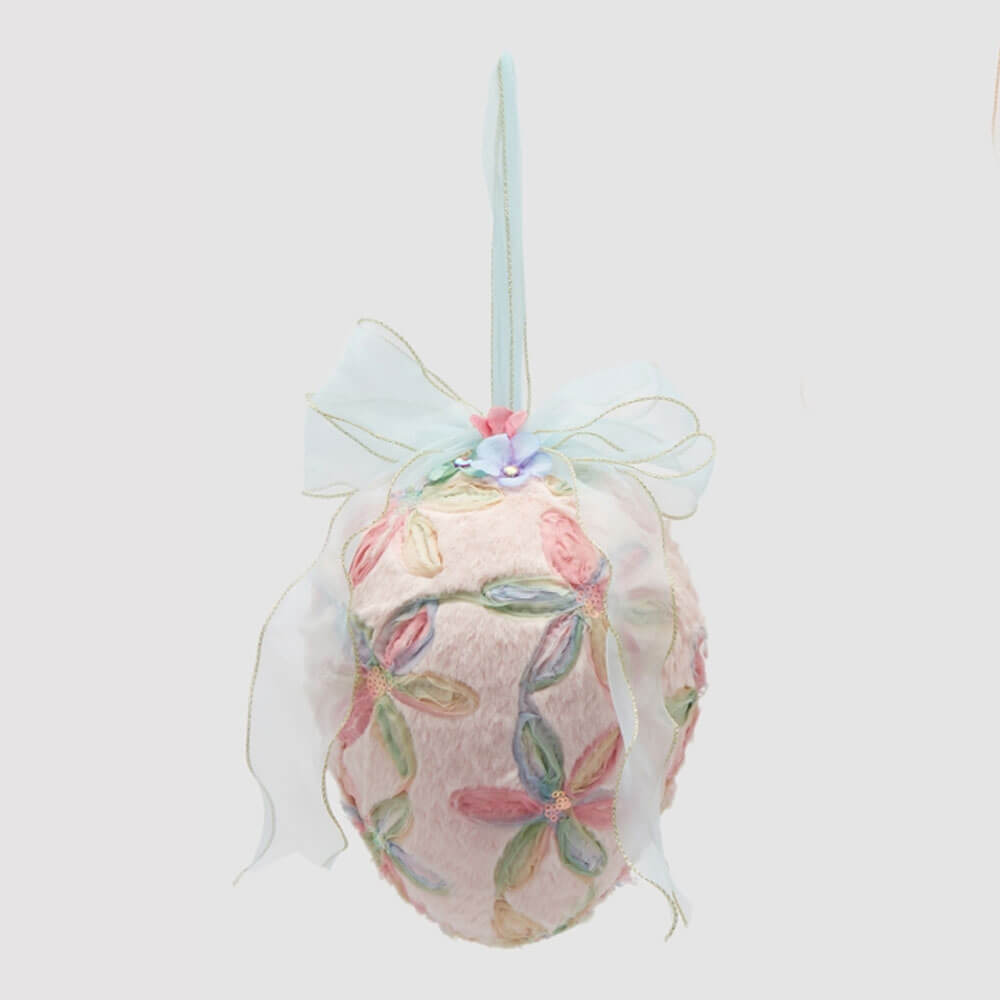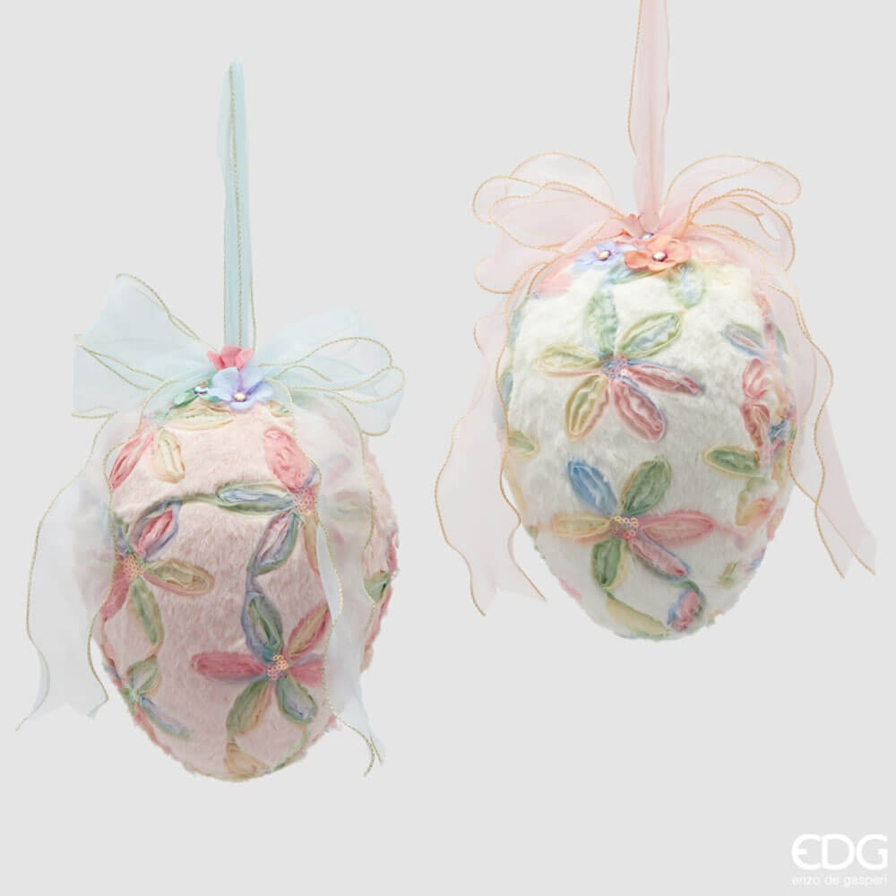 Questo uovo decorativo da appendere firmato Enzo de Gasperi è realizzato in polistirolo rivestito in tessuto morbido effetto velluto, in una delicata tonalità rosa cipria. La superficie è arricchita da applicazioni floreali in tessuto dai colori pastello, con piccoli dettagli luminosi che donano profondità e raffinatezza.