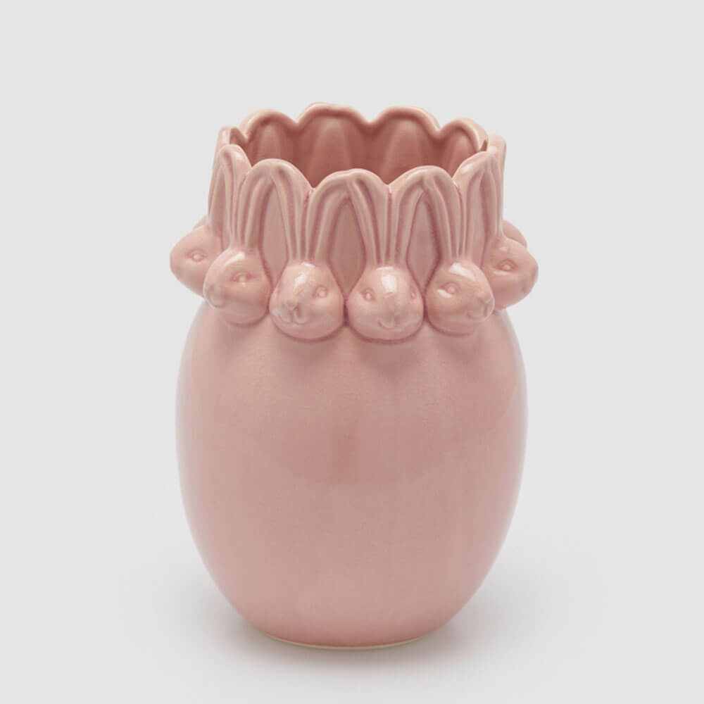 Vaso pasquale bombato in ceramica fatta a mano con conigli in rilievo e bordo ondulato. Delicato rosa cipria.