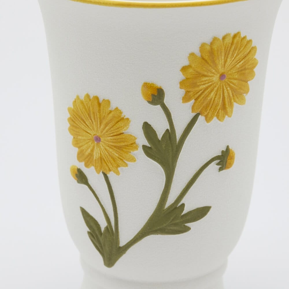 Vaso in ceramica bianca decorato con eleganti motivi floreali gialli in rilievo. Ideale per arredare con stile ambienti moderni e romantici.