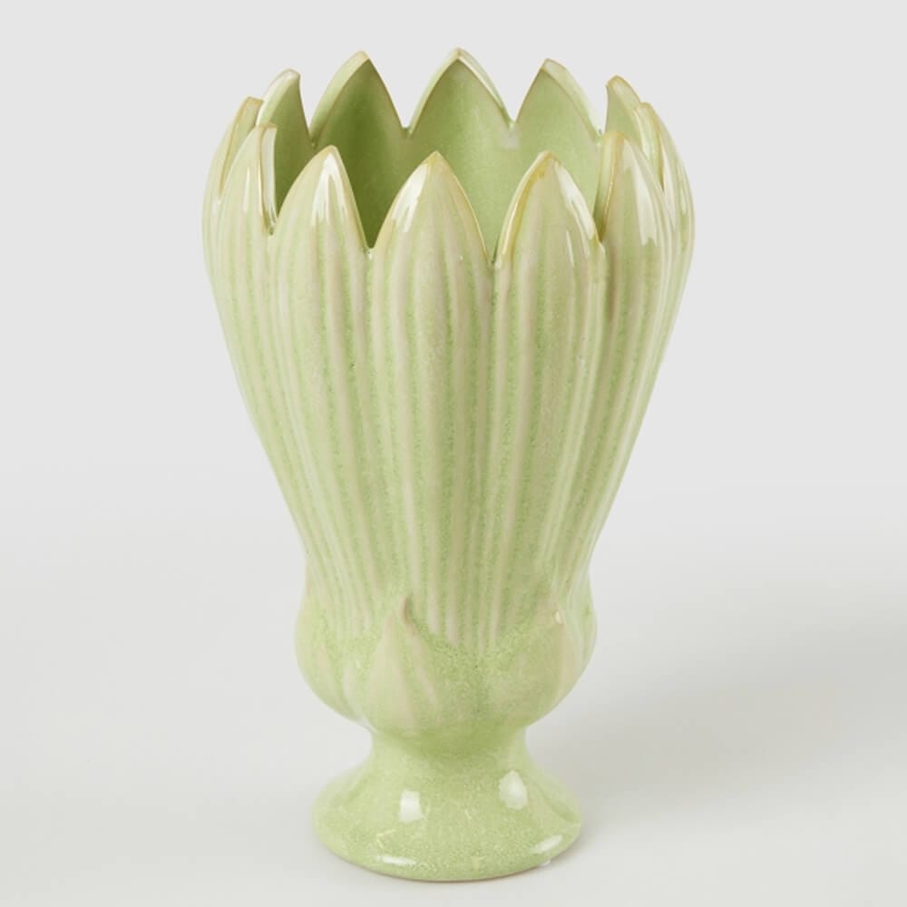 La tonalitร verde tenue, combinata con sottili sfumature naturali, rende questo vaso ideale per decorazioni floreali fresche o per essere utilizzato come oggetto decorativo in salotti, ingressi o camere da letto. Un pezzo versatile che arricchirร ogni ambiente con il suo stile raffinato.
