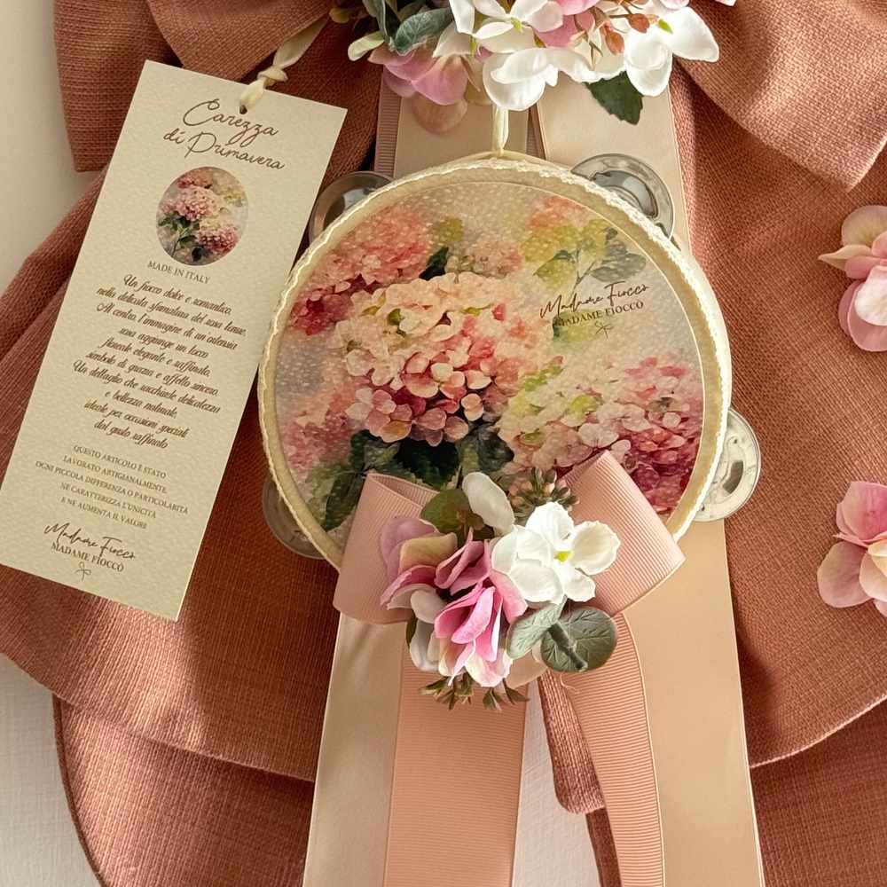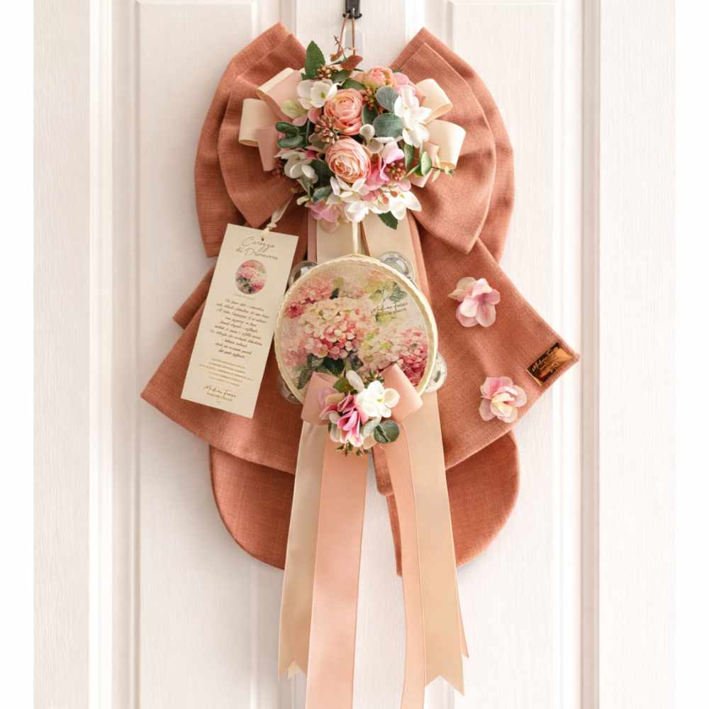 Il Fiocco Carezza di Primavera h 50 cm porta in casa un’atmosfera morbida e luminosa: la base tessile in tonalità rosa caldo accoglie una composizione floreale nei toni del rosa e del bianco, con accenti verdi. Al centro, un tamburello decorativo con stampa floreale diventa il punto focale, completato da nastri chiari e rosa cipria che scendono con leggerezza.
