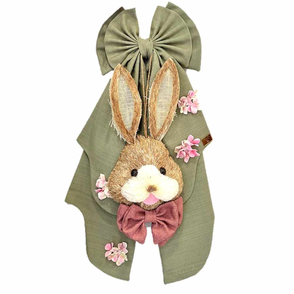 Fioccò Fiaba di Primavera si presenta con un grande fiocco in tessuto verde e code morbide, pensate per creare movimento e presenza sulla parete. Al centro, il coniglio decorativo diventa il punto focale, completato da un fiocco in tonalità rosa e da piccoli fiori applicati.