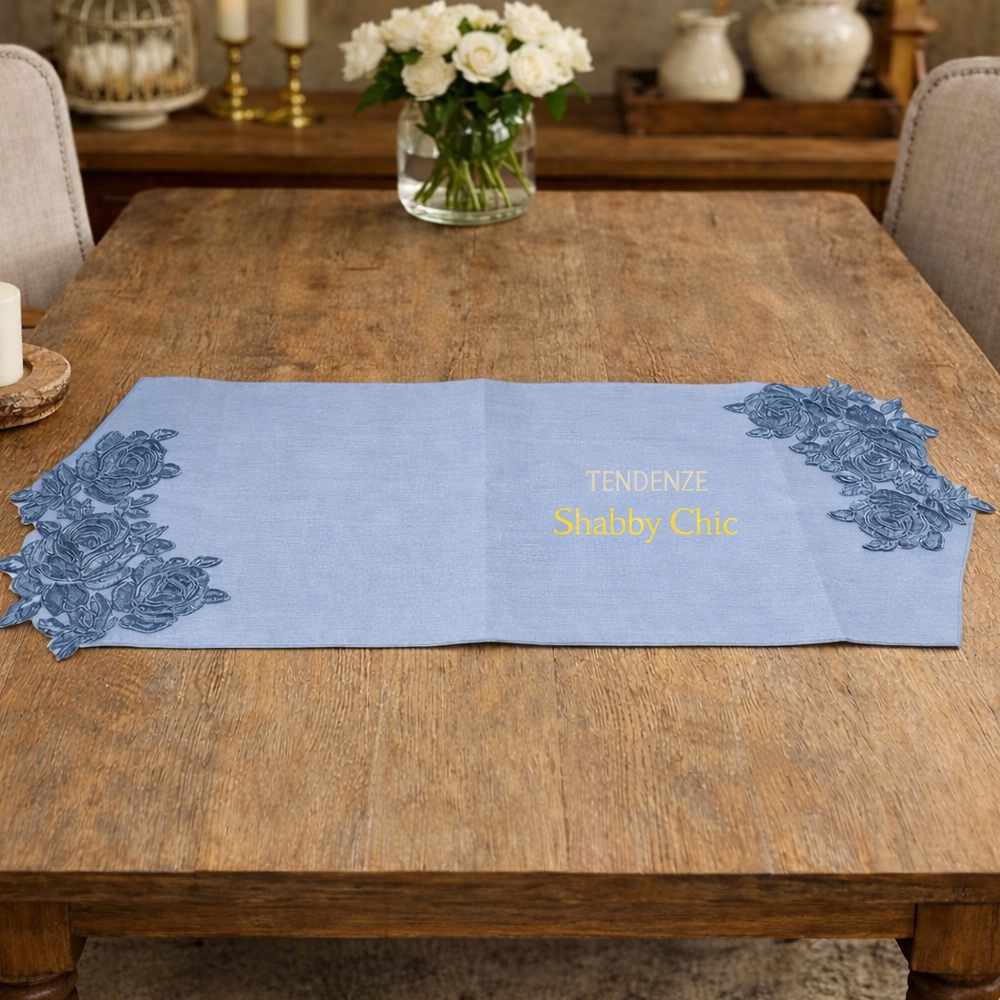 Con la sua tonalità azzurra delicata e l’applicazione in pizzo floreale, questo centrino a punta Fiori di Lena evoca l’eleganza poetica dello stile shabby chic.