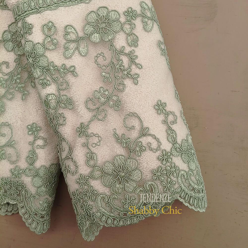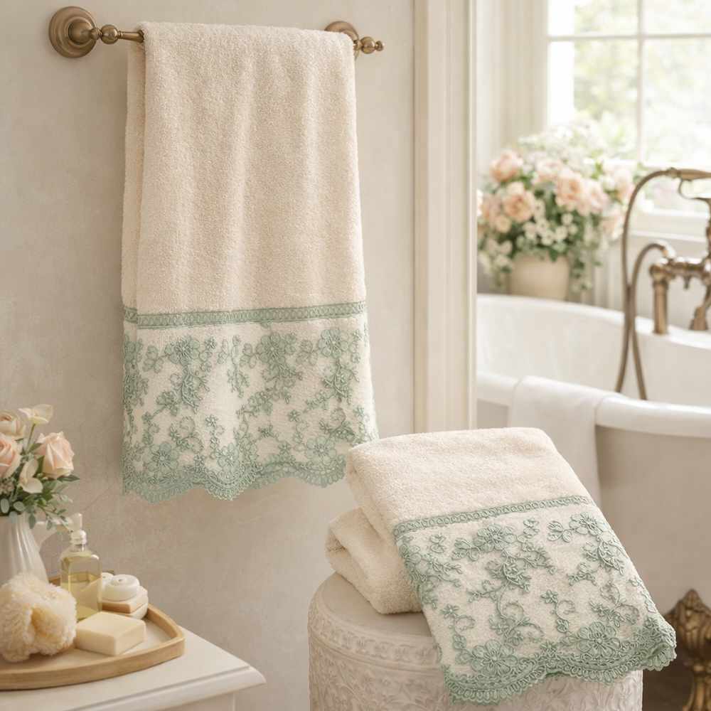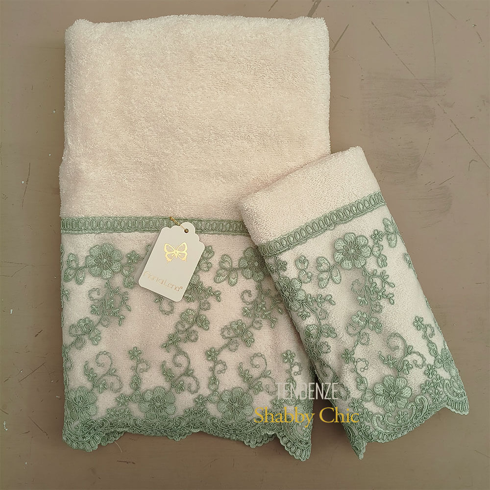 Un piccolo lusso quotidiano firmato Fiori di Lena: questa coppia di asciugamani in spugna avorio con pizzo verde è una poesia di delicatezza e freschezza. Lavorati a mano in Italia con cotone 100% di alta qualità, sono profumati con essenze leggere e naturali, per un’esperienza di benessere totale.