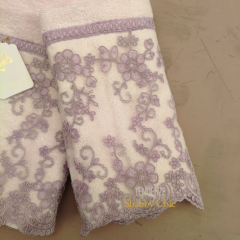 Raffinata e femminile, la coppia asciugamani Fiori di Lena con pizzo lilla dona poesia e charme al bagno. Perfetta anche come regalo romantico.
