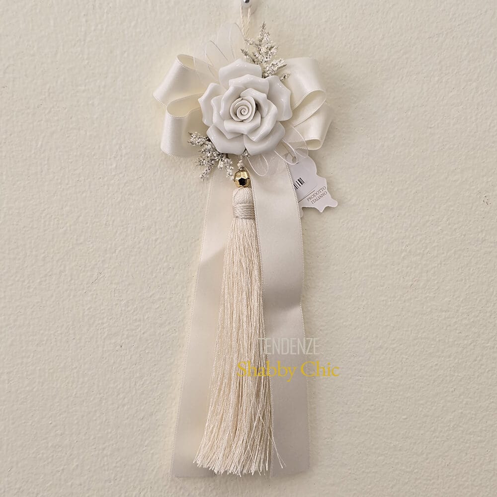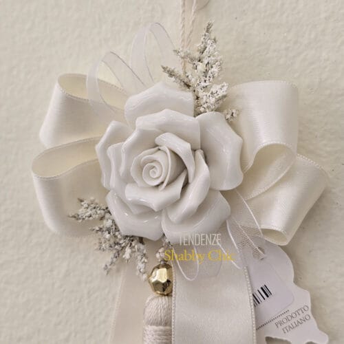 La nappina panna di Fiori di Lena è una creazione elegante e romantica, perfetta per impreziosire gli ambienti con un tocco delicato. Il nastro in raso panna avvolge la composizione con morbidezza, mentre al centro sboccia una meravigliosa rosa in ceramica bianca, finemente lavorata a mano. Accenti di nebbiolina e un elemento dorato aggiungono preziosità e luce, rendendo l’insieme sofisticato e armonioso.