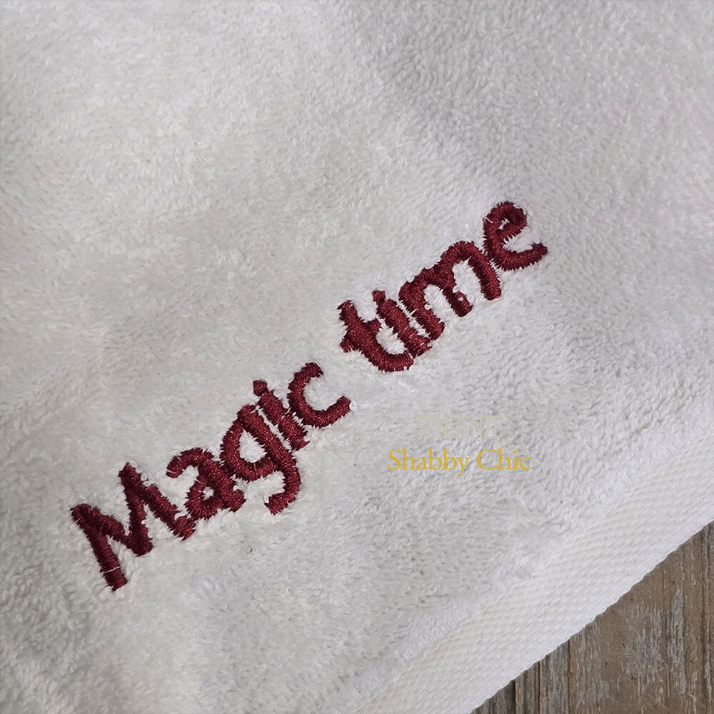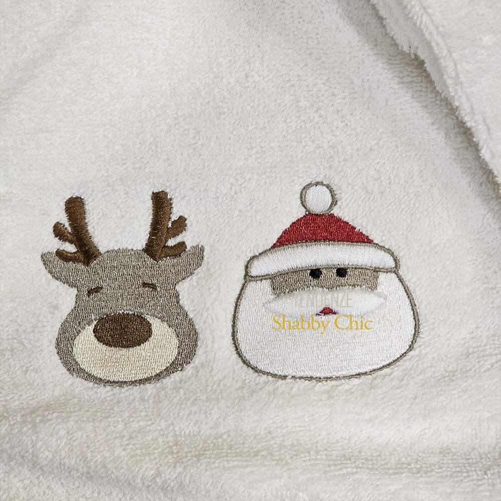 Set composto da 2 asciugamani in spugna 100% cotone bianco, decorati con ricami natalizi (renna e Babbo Natale) e scritta rossa “Magic time”.