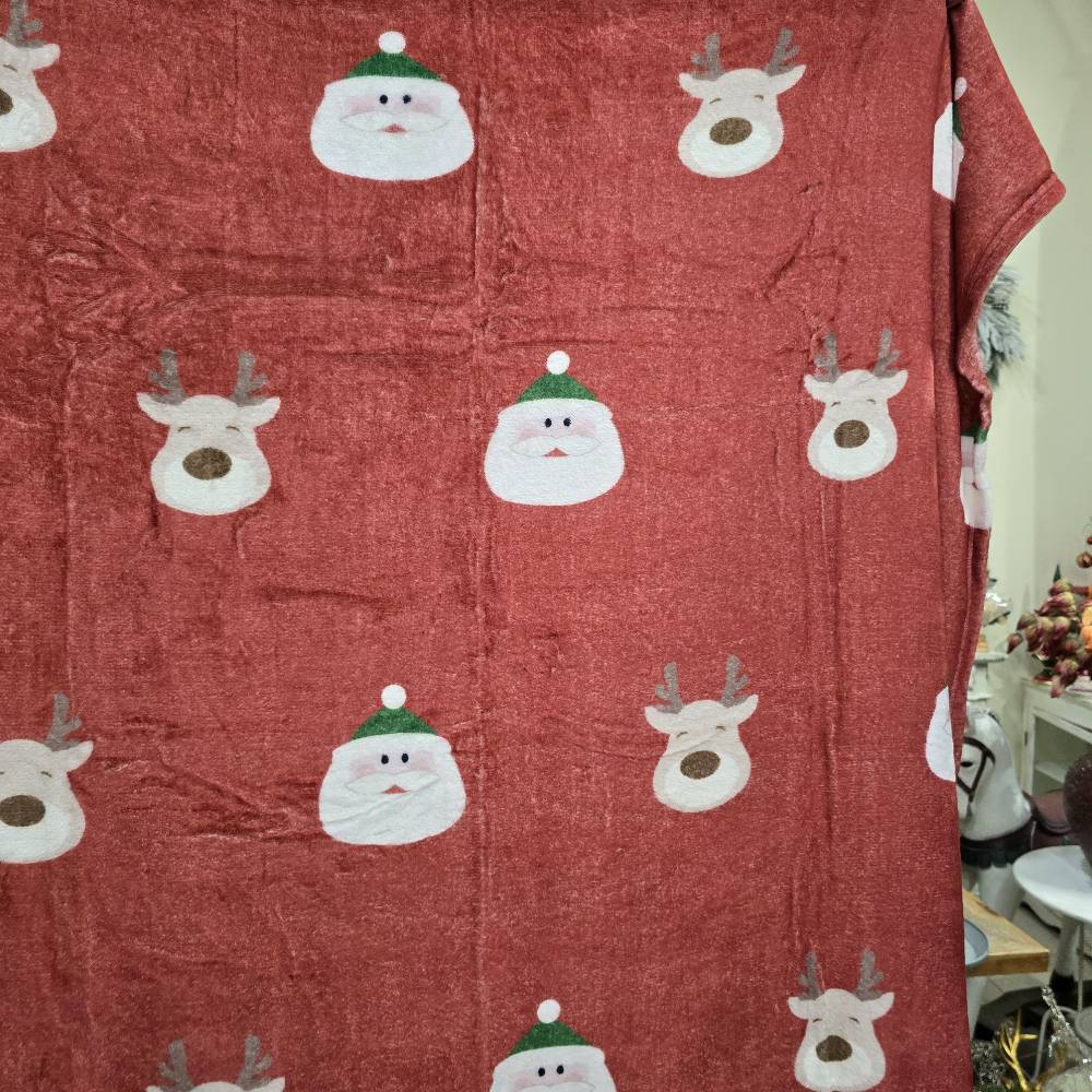Morbido plaid natalizio rosso con stampa renne e babbo natale.