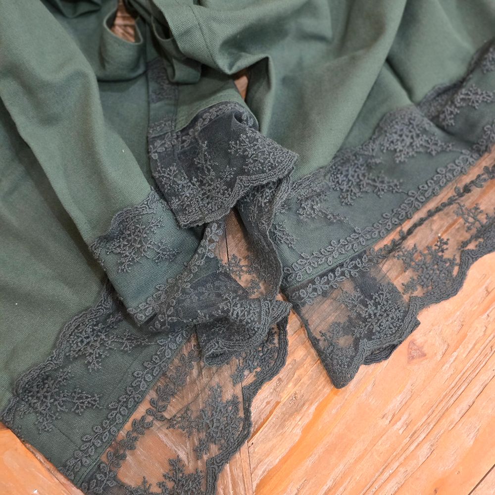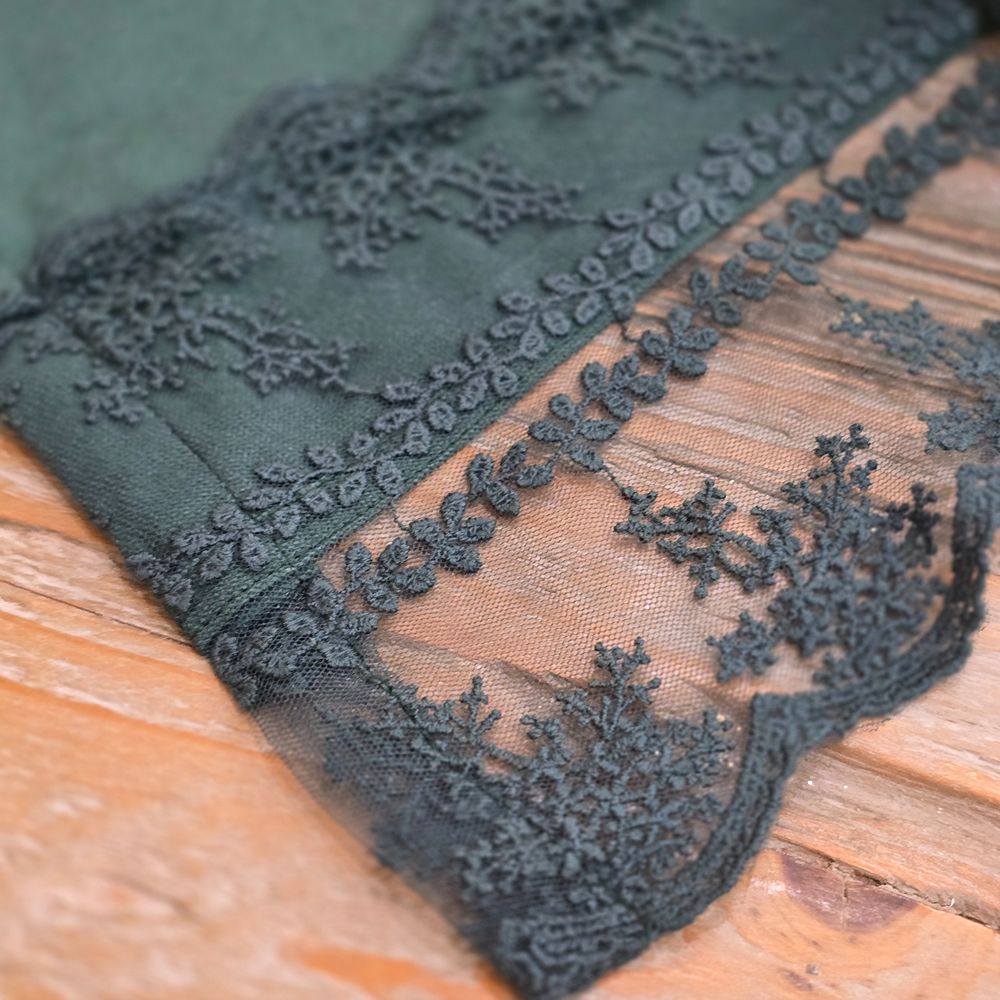 La tonalità verde bosco, intensa e profonda, si sposa magnificamente con ambienti naturali, rustici o classici, ma risalta anche su tavole moderne grazie alla sua eleganza senza tempo. Il ricamo delicato su tulle dona movimento e leggerezza, creando un raffinato gioco di trasparenze.