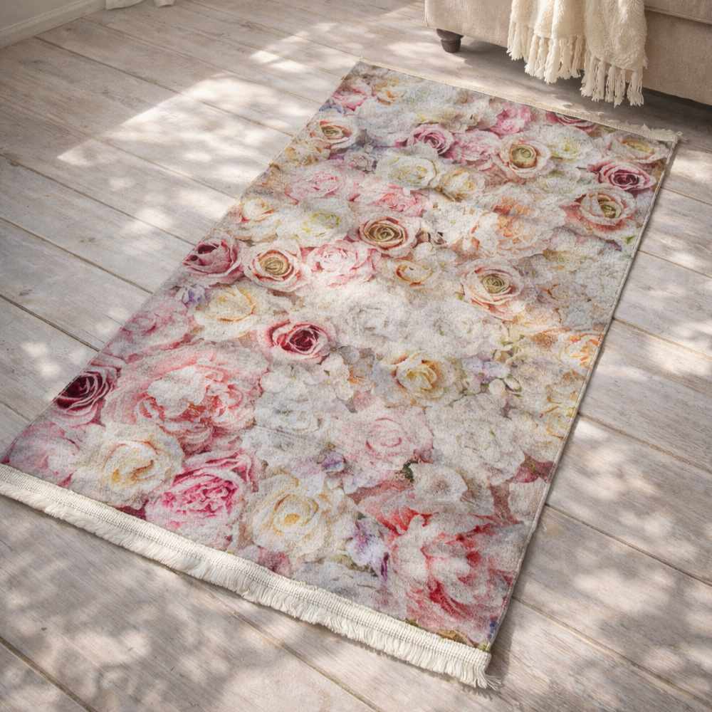 La stampa ad effetto pittorico crea un insieme armonioso e dinamico, con fiori che sembrano sovrapporsi creando profondità e movimento. La texture velour dona una sensazione morbida e vellutata alla vista e al tatto, esaltando le sfumature cromatiche e rendendo il tappeto ancora più luminoso.