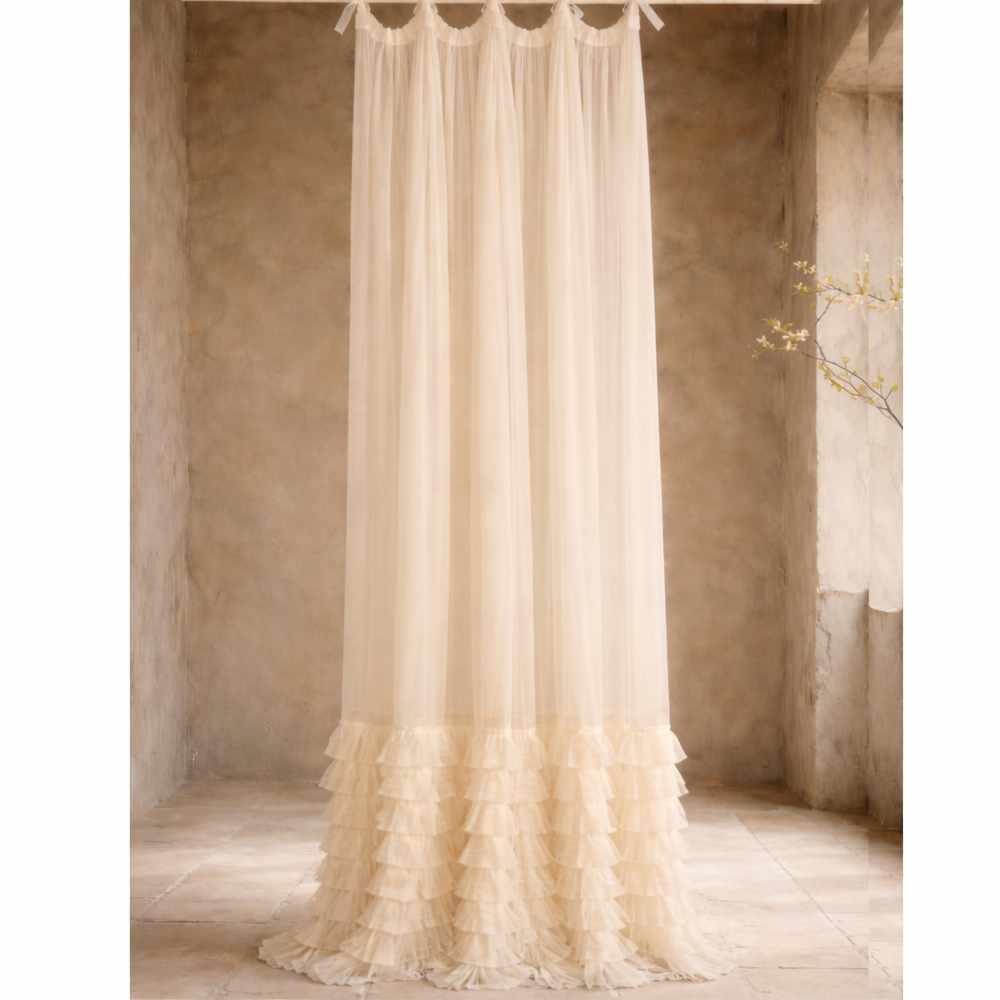 Una tenda raffinata e affascinante in tulle color avorio, impreziosita da romantiche rouche nella parte inferiore. La tonalità calda e avvolgente dona un effetto morbido e lussuoso, perfetto per ambienti eleganti e shabby chic.