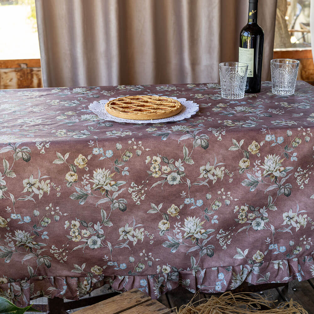 Realizzata in cotone resinato, questa tovaglia unisce la bellezza di un tessuto naturale con la praticità della finitura antimacchia. Il colore di fondo, un caldo tono prugna, è decorato con fiori delicati nei toni del crema, azzurro polvere e verde salvia, per un effetto armonioso e ricercato. La gala arricciata sul bordo dona movimento e romanticismo alla composizione.