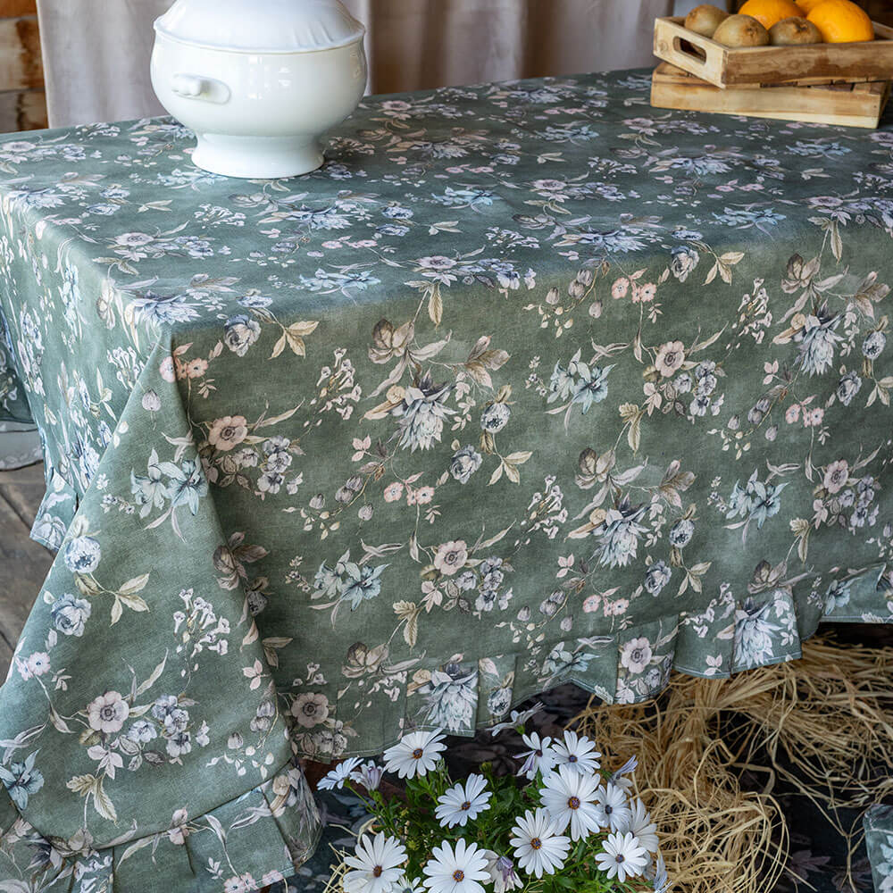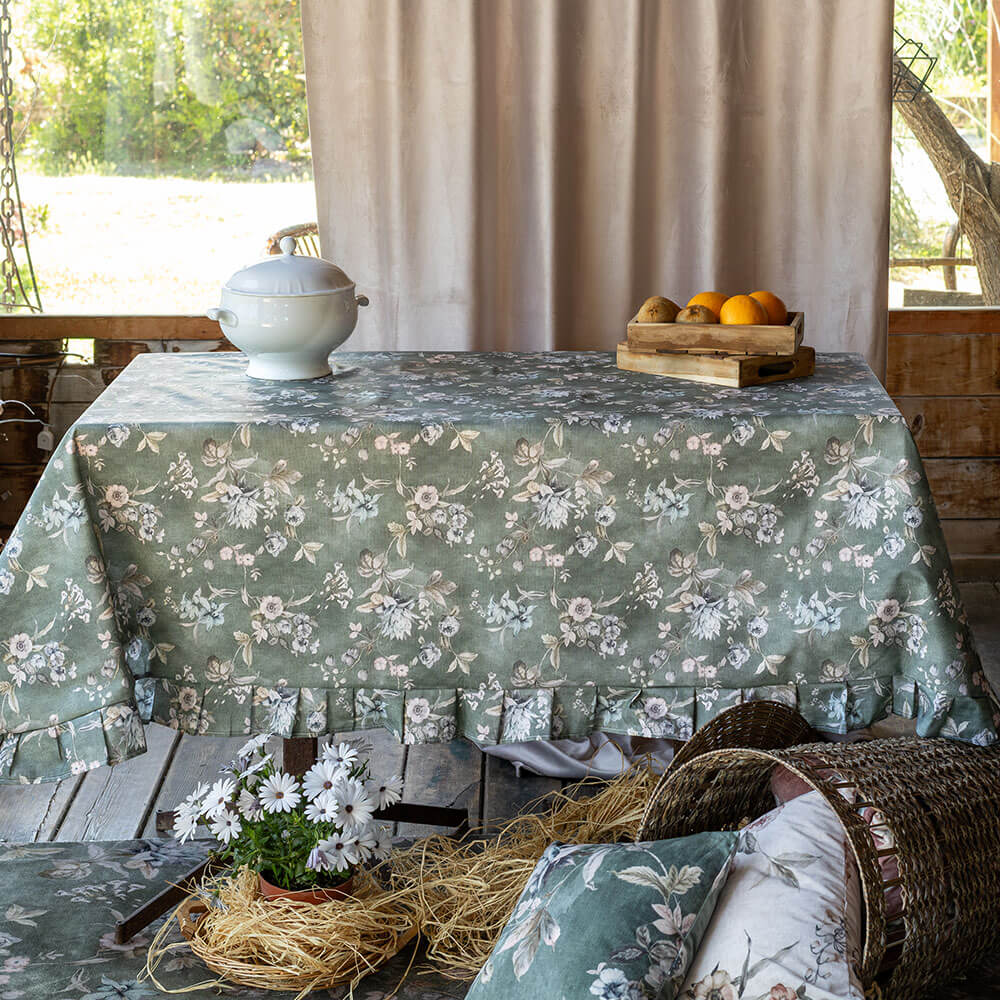 Tovaglia in cotone resinato verde con stampa floreale nei toni rosa e crema, finita con gala arricciata lungo il bordo.