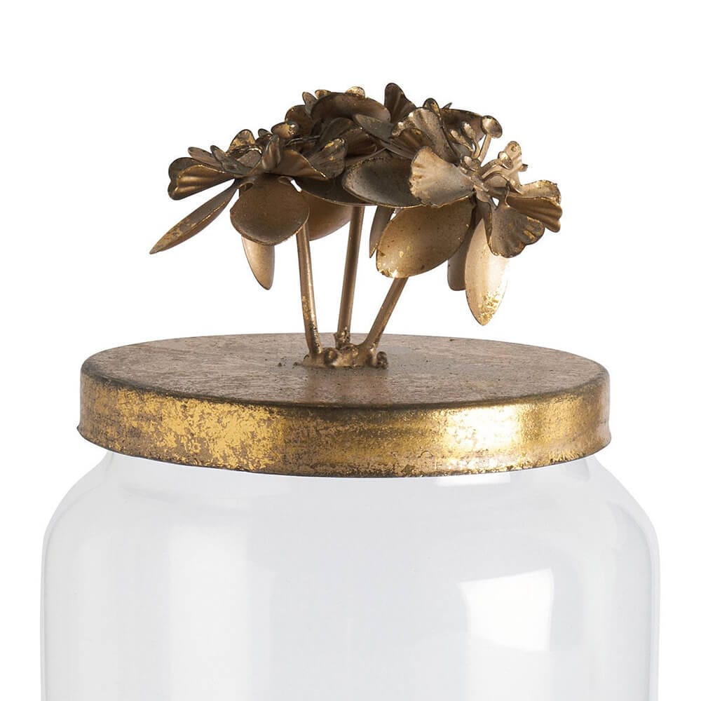 Il barattolo porta caramelle Floral Idyll di Mathilde M è un oggetto raffinato che unisce funzionalità e poesia. Realizzato in vetro trasparente, permette di vedere il contenuto al suo interno, mentre il coperchio in metallo dorato, con finitura leggermente antichizzata, è arricchito da un romantico bouquet di fiori in rilievo, interamente scolpiti a mano.