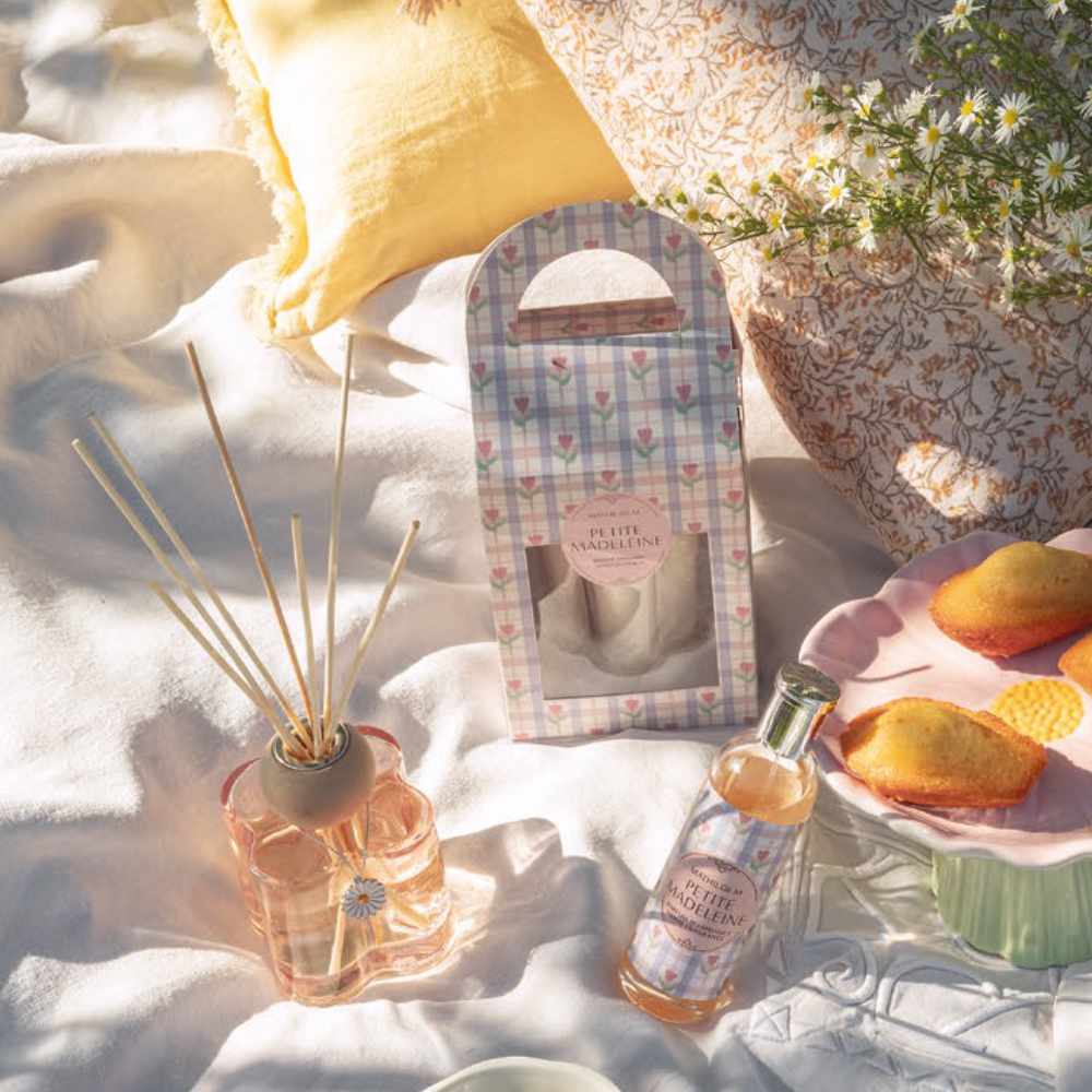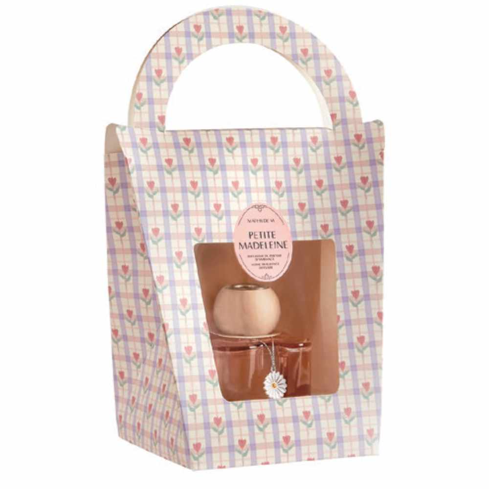 Diffusore per ambiente della collezione Gourmandises d’Été in vetro con profumo “Petite Madeleine”. Il flacone, elegante e luminoso, è completato da un tappo sferico in legno naturale e da un romantico charm a margherita. Inclusi 7 bastoncini in rotin sbiancato da 25 cm. Confezione regalo a shopper con manico, fantasia pastello a quadretti con piccoli motivi floreali e finestra frontale.