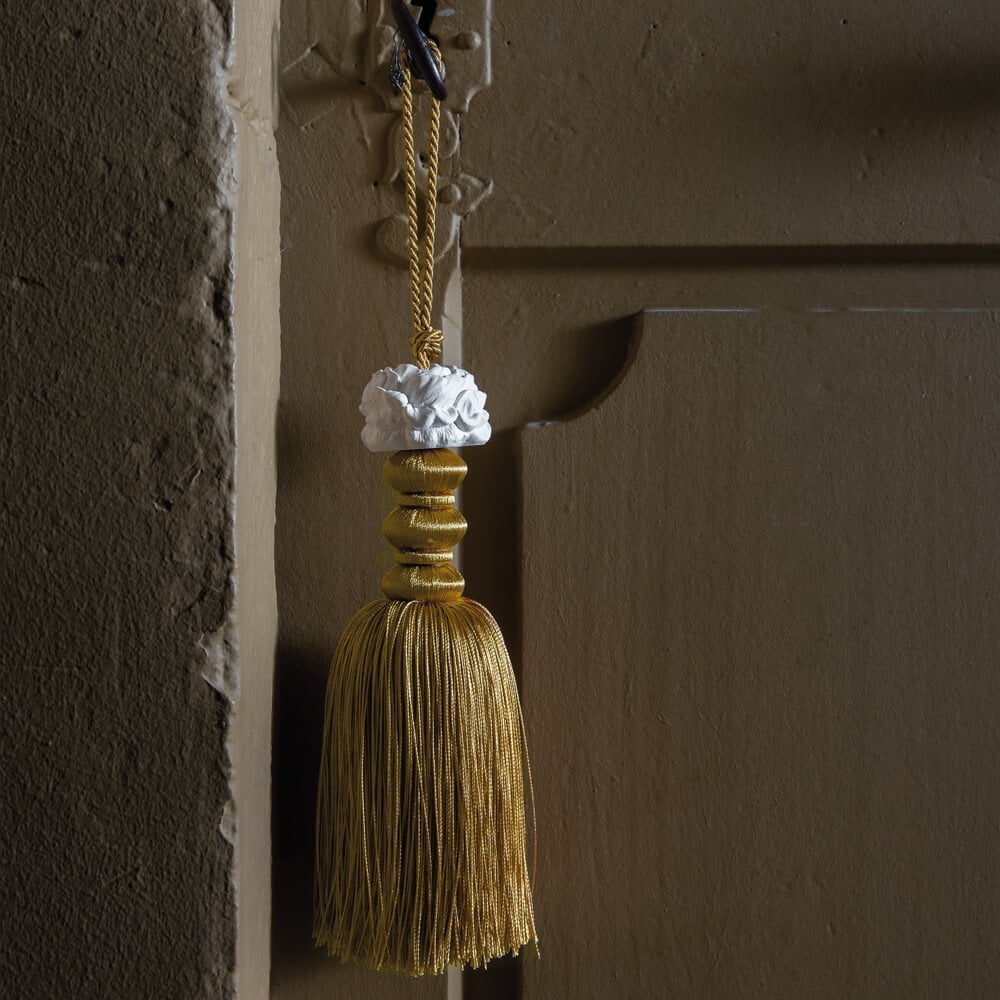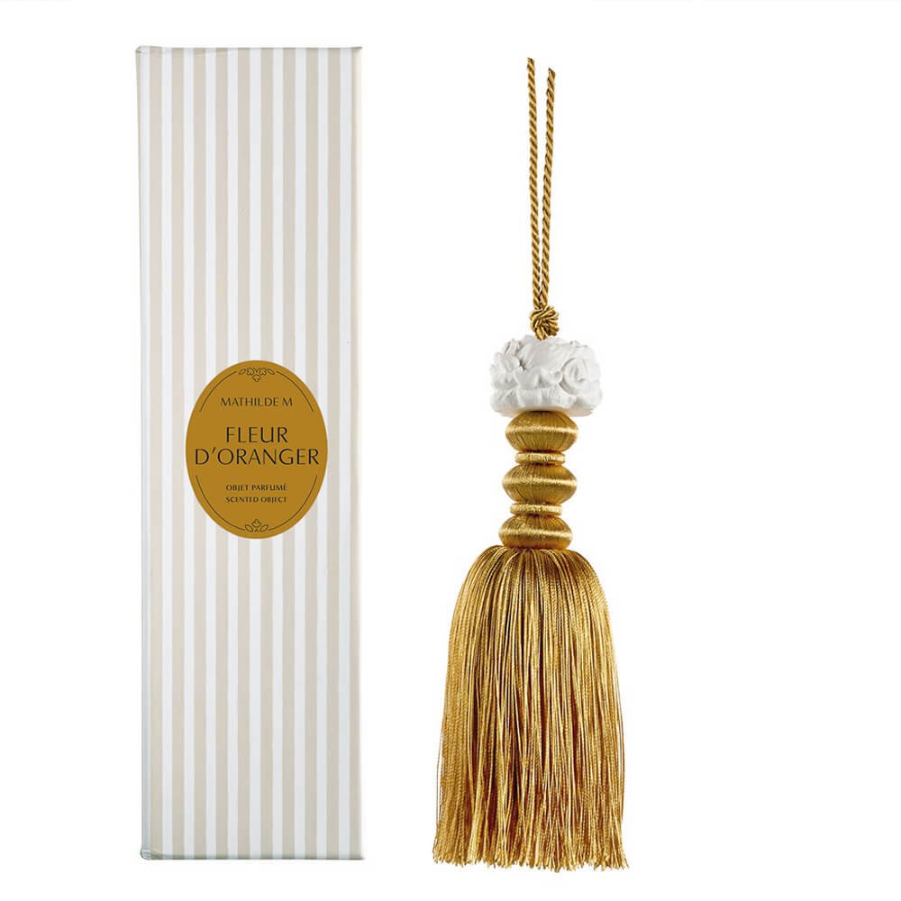 Nappa profumata molto raffinata, con decorazione in gesso cesellato meticolosamente a mano e profumato nei laboratori Mathilde M., puoi utilizzarla in tantissimi modi come ferma tenda, intorno ad una una maniglia di una porta o di una finestra, o su una chiave, ti incanterà con l’essenza Fleur d’oranger.