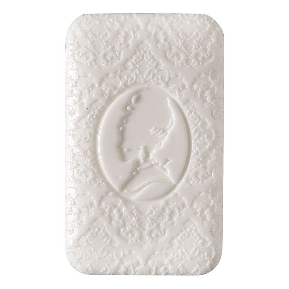 Il sapone, in colore avorio, presenta un elegante decoro in rilievo: un cammeo con profilo femminile circondato da motivi damascati, che richiama il gusto classico francese. Perfetto per impreziosire un bagno in stile shabby chic o come idea regalo.