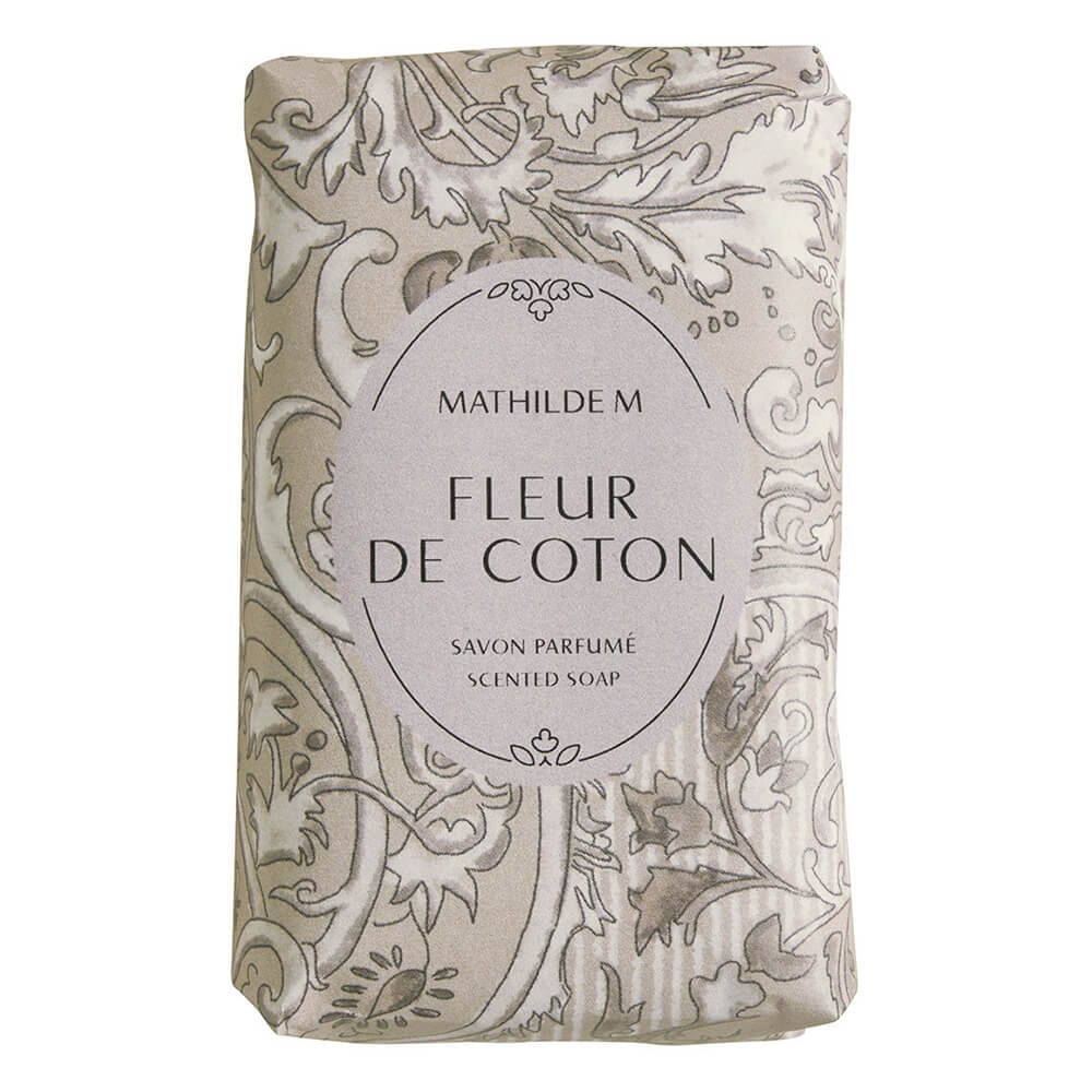 La saponetta profumata Fleur de Coton di Mathilde M unisce delicatezza e raffinatezza in un piccolo gioiello da bagno o da regalare. Racchiusa in una confezione dalla stampa floreale vintage in toni neutri e cipria, emana una fragranza delicata e pulita che richiama la freschezza del lino appena steso al sole.