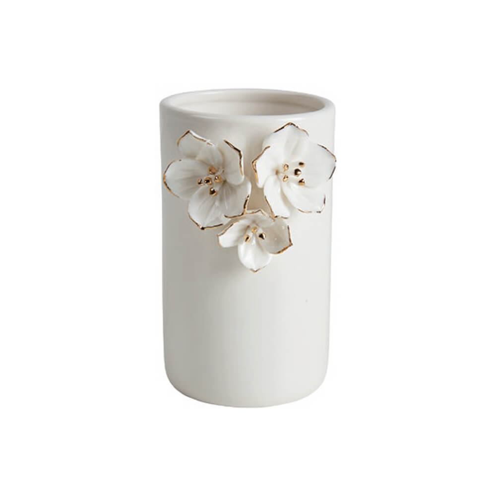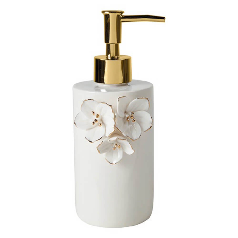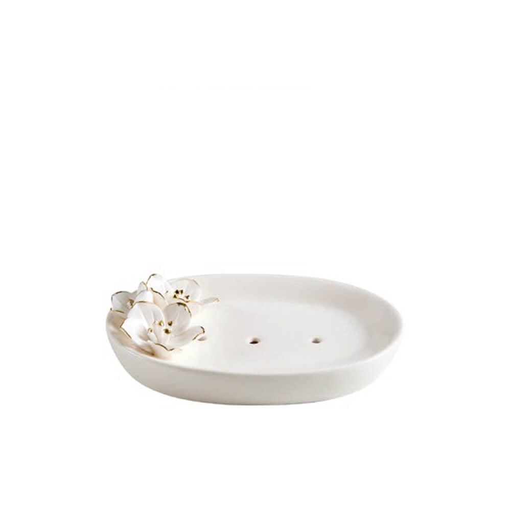 Romanticissimo set bagno in ceramica bianca opaca con dettagli floreali e perfilo dorato, della collezione Amour de Fleurs di Mathilde M.