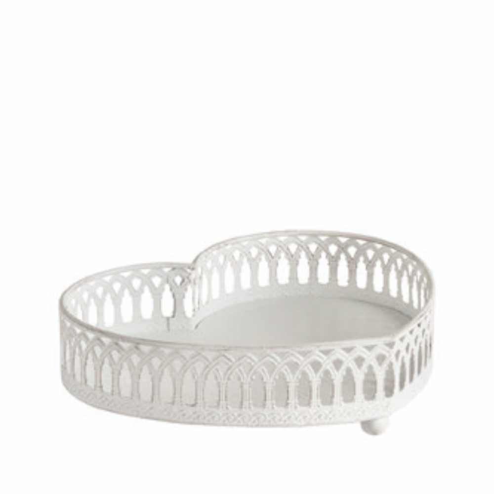 La struttura in metallo verniciato bianco ha una forma a cuore ben definita, con bordo alto e una raffinata fascia traforata: gli archi ripetuti ricordano una piccola balaustra, leggera e decorativa. La base è rialzata da piedini che lo rendono stabile e scenografico su consolle, comò o in bagno.