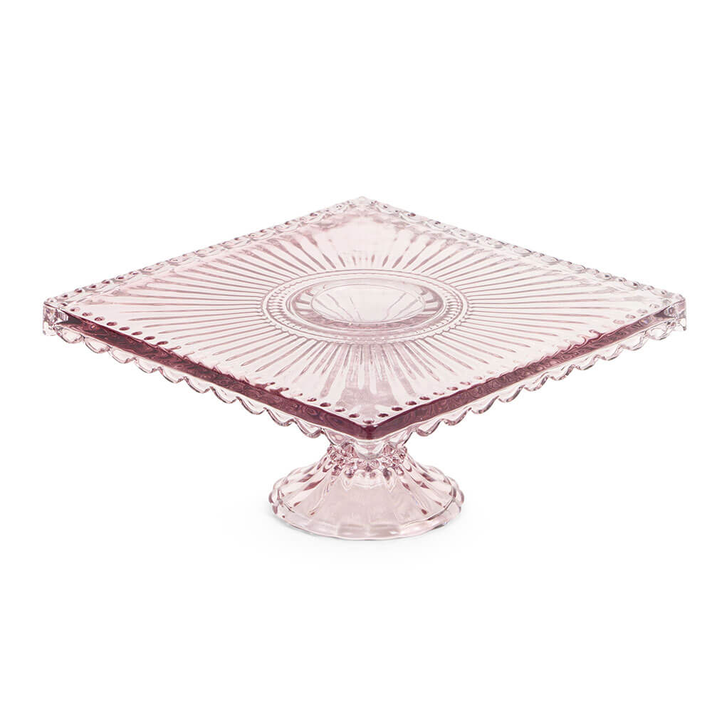 L’alzata Fiorirà in vetro rosa cipria dona luce e romanticismo alla tavola. Il piano quadrato ha un decoro a raggiera in rilievo, con rosetta centrale e bordo ondulato punteggiato: dettagli che fanno subito “mise en place”. Base ampia e stabile, perfetta per torte monoporzione, biscotti e frutta.