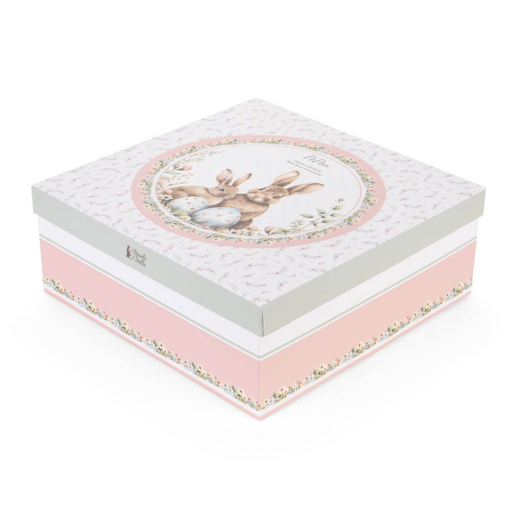 L’alzatina PePen di Nuvole di Stoffa è un elemento decorativo e funzionale pensato per impreziosire la tavola delle feste. Realizzata in porcellana liscia e luminosa, presenta un piatto ampio con illustrazione centrale di due coniglietti accanto a ovetti pasquali, circondati da piccoli fiori e dettagli primaverili.