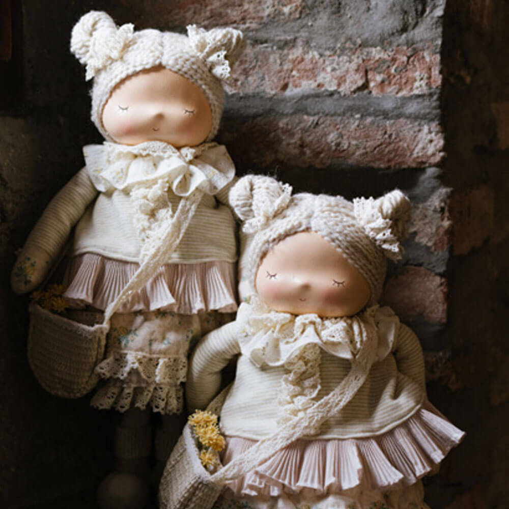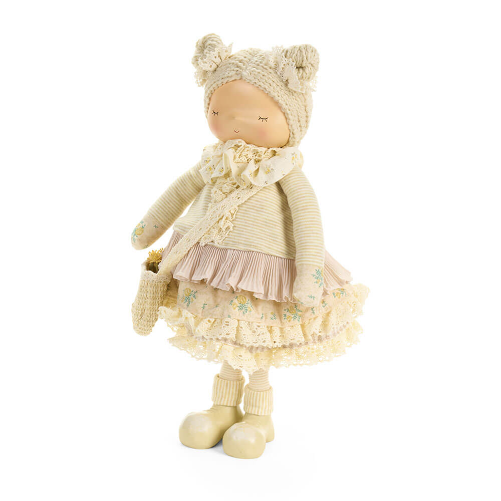 Una presenza dolce che scalda subito l’ambiente: questa bambola Nuvole di Stoffa è alta 38 cm e veste toni crema e beige, con dettagli raffinati in pizzo e tessuti stampati. Il viso sereno con occhi chiusi, il cappellino lavorato a maglia e la gonna floreale con balze creano un effetto romantico, perfetto su mensole, comò o in cameretta. La tracollina in pizzo con mini borsetta aggiunge un tocco “handmade” irresistibile. Ideale anche da abbinare a lanterne e decori delicati per un angolo cosy.