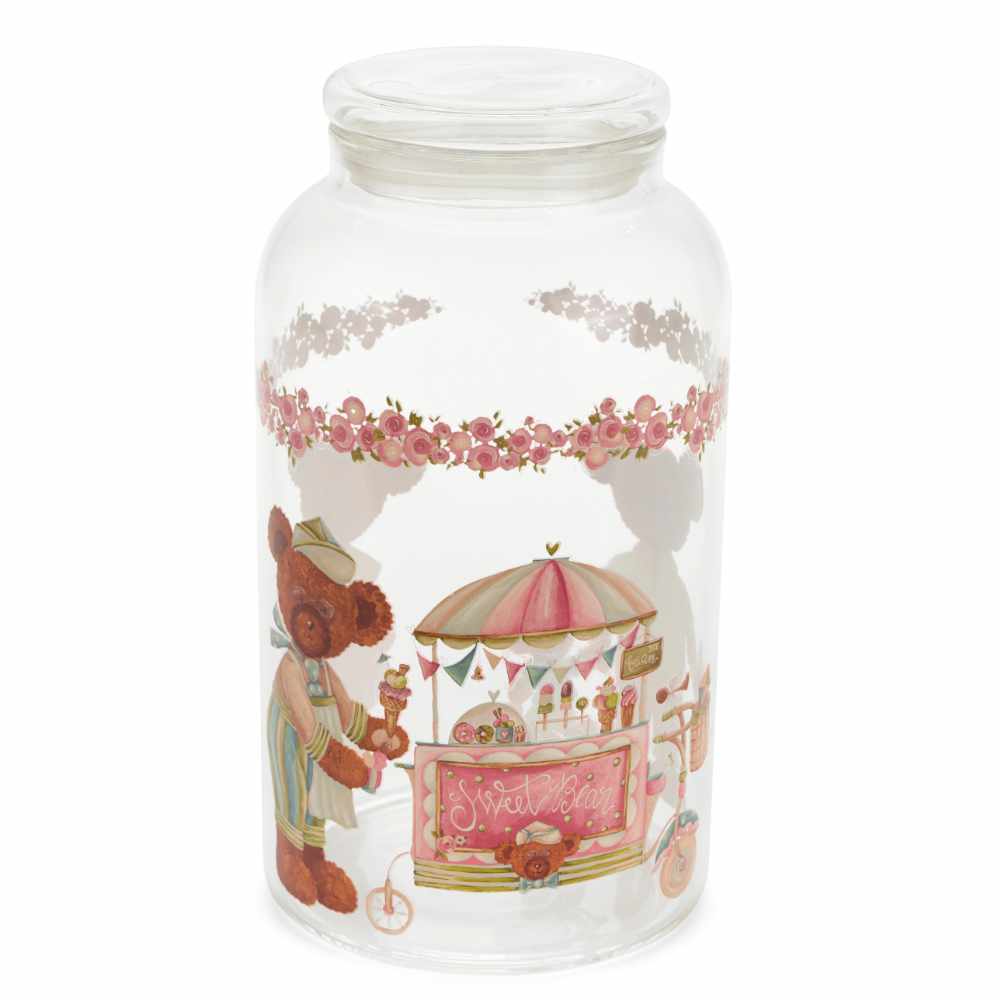 Elegante barattolo ermetico in borosilicato trasparente con coperchio, impreziosito da illustrazioni Sweet Bear: orsetti, carrettino “Sweet Bear” e bordura di roselline rosa. Capiente (2300 ml), tiene in ordine e valorizza dispensa e tavola: biscotti, pasta, cereali o confetti diventano subito decorazione.