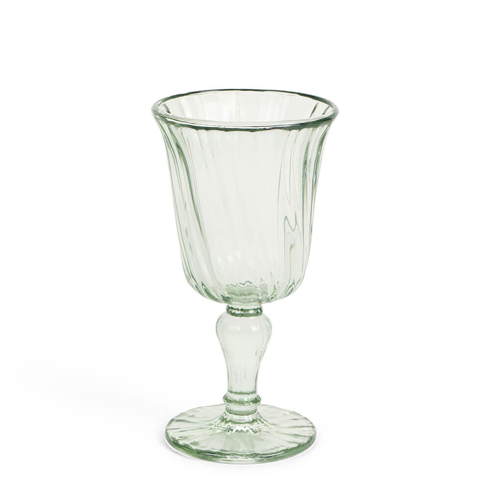 Il calice PePen è in vetro verde delicato, con effetto ondulato e costolature che catturano la luce. Bordo svasato, stelo con dettaglio a goccia e piede largo rigato per una stabilità impeccabile. Ideale per acqua, vino o per servire dessert, rende speciale ogni apparecchiatura shabby chic.