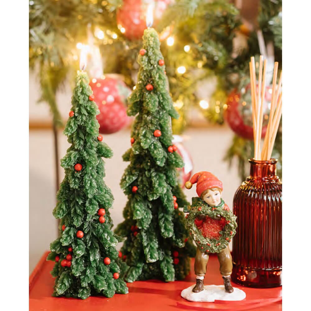 Candela in cera modellata a forma di albero di Natale, con rami cesellati e bacche rosse in rilievo. Tonalità verde abete con dettagli realistici e leggera finitura glitterata. Perfetta per decorare la casa con gusto durante le festività.