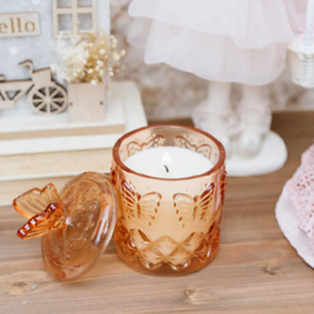 Candela profumata in bicchiere di vetro color ambra/arancio, con lavorazione in rilievo: farfalle sui lati e motivo geometrico sul fondo, effetto gioiello. Completa di tappo abbinato con manico a farfalla, luminoso e decorativo. Perfetta per creare atmosfera in salotto, camera o bagno e bellissima anche come idea regalo.